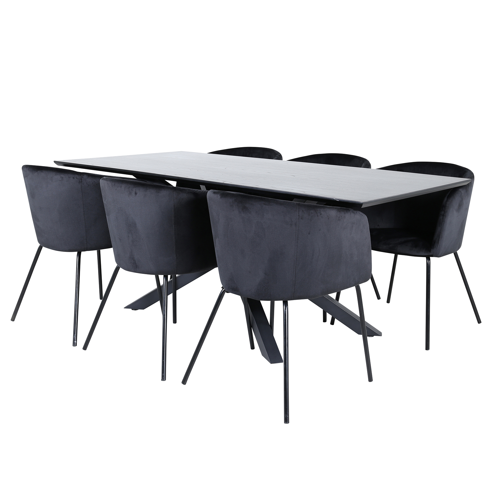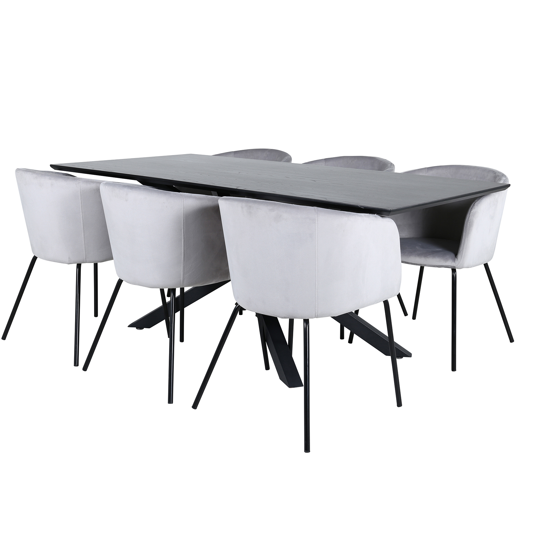 Matgrupp Piata, med ett matbord i MDF med faner med bordsben i järn. Matchas med 6 st Bergen matstolar med sitsar i sammet.