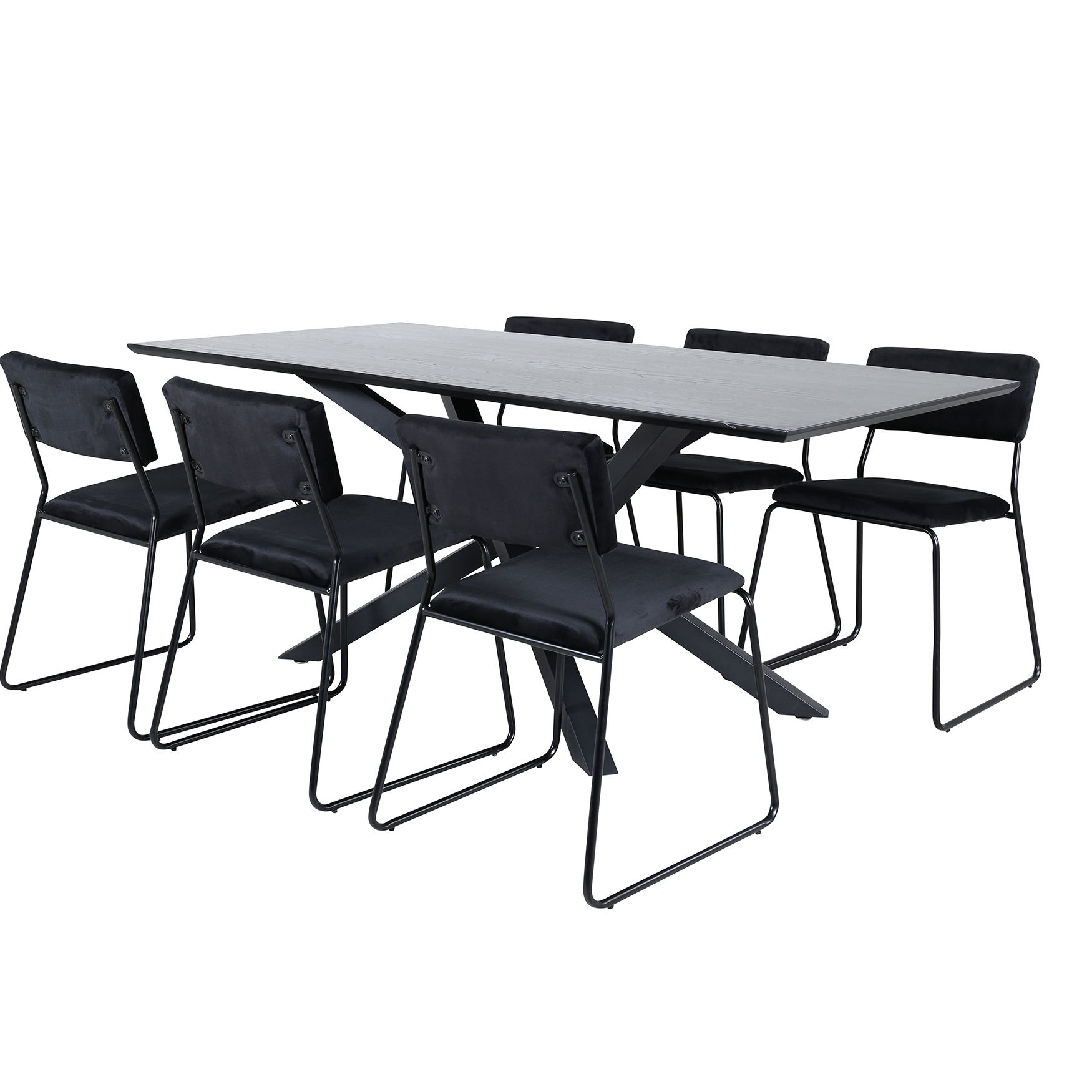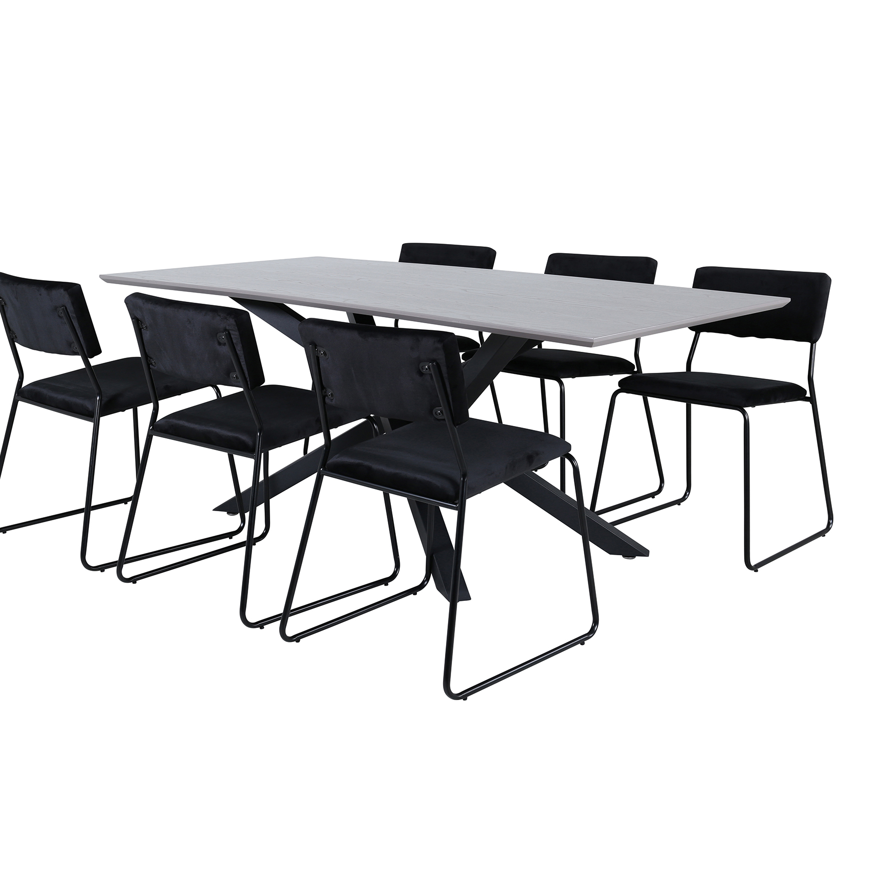 Matgrupp Piata, med ett matbord i MDF med faner med bordsben i järn. Matchas med 6 st Kungshamn matstolar i sammet.