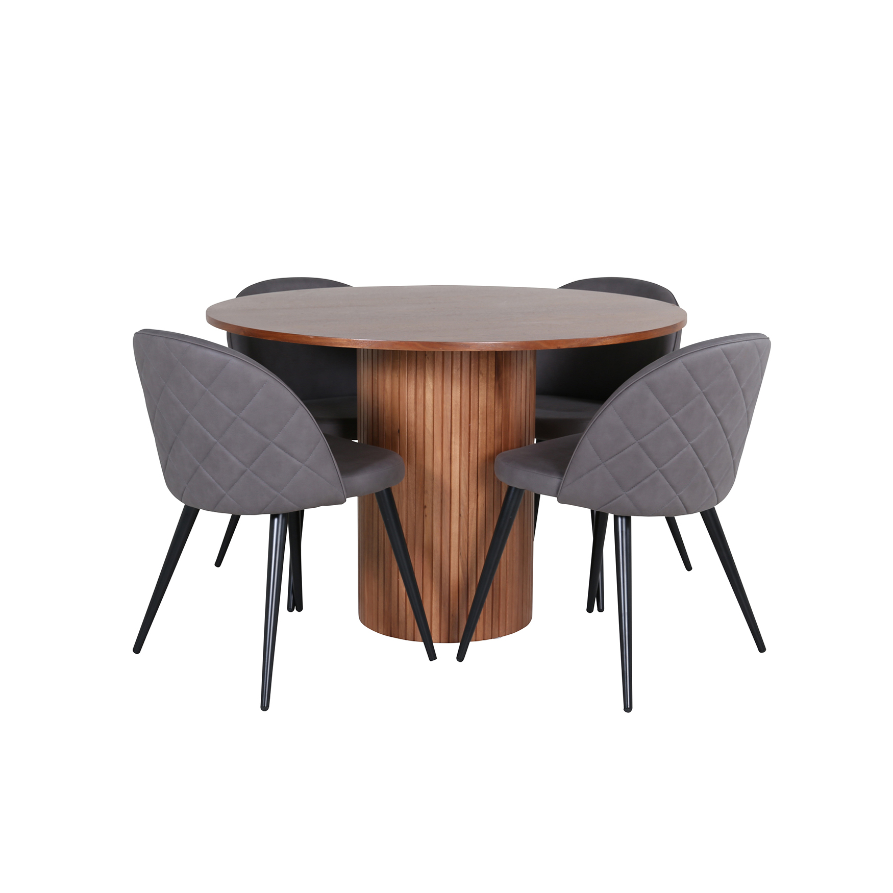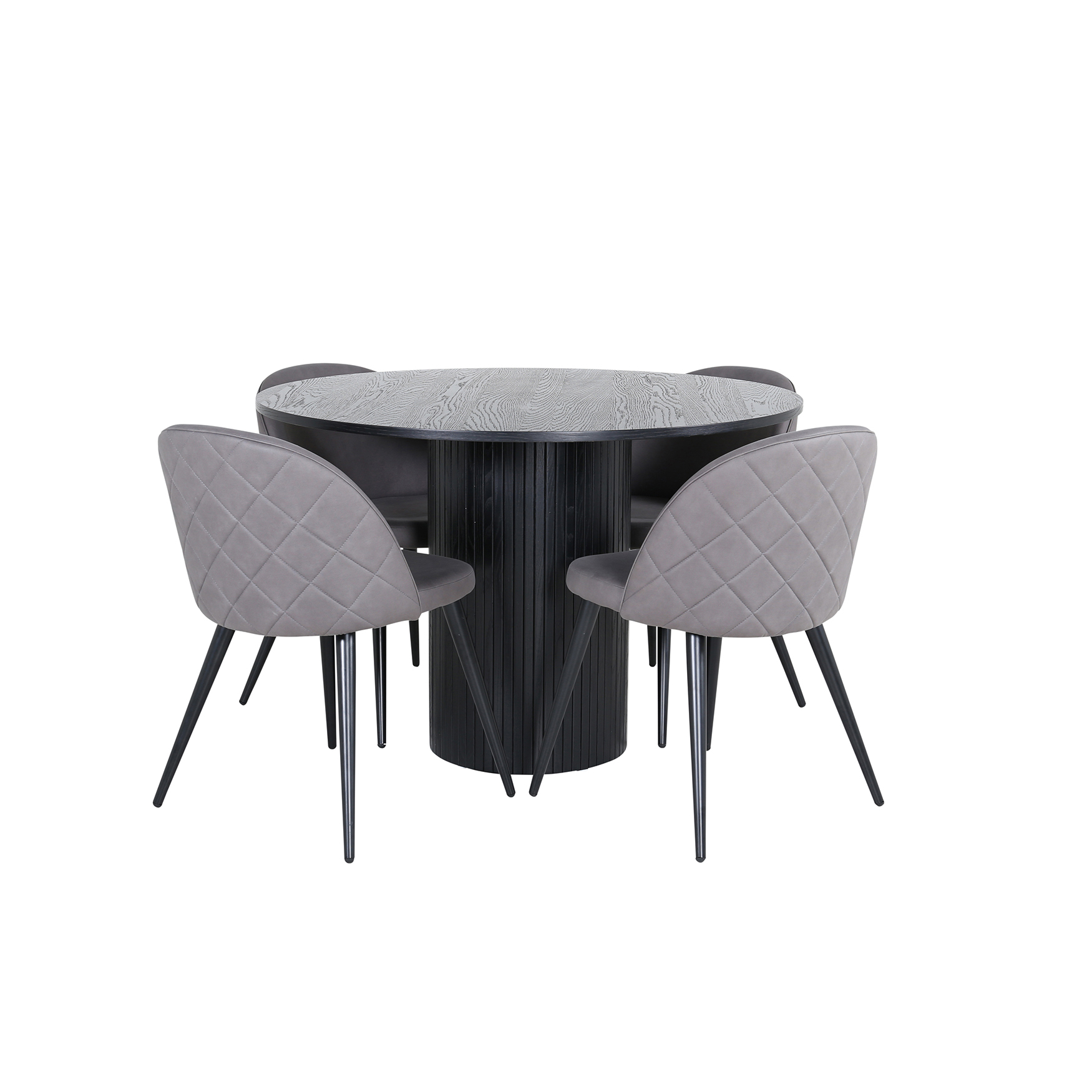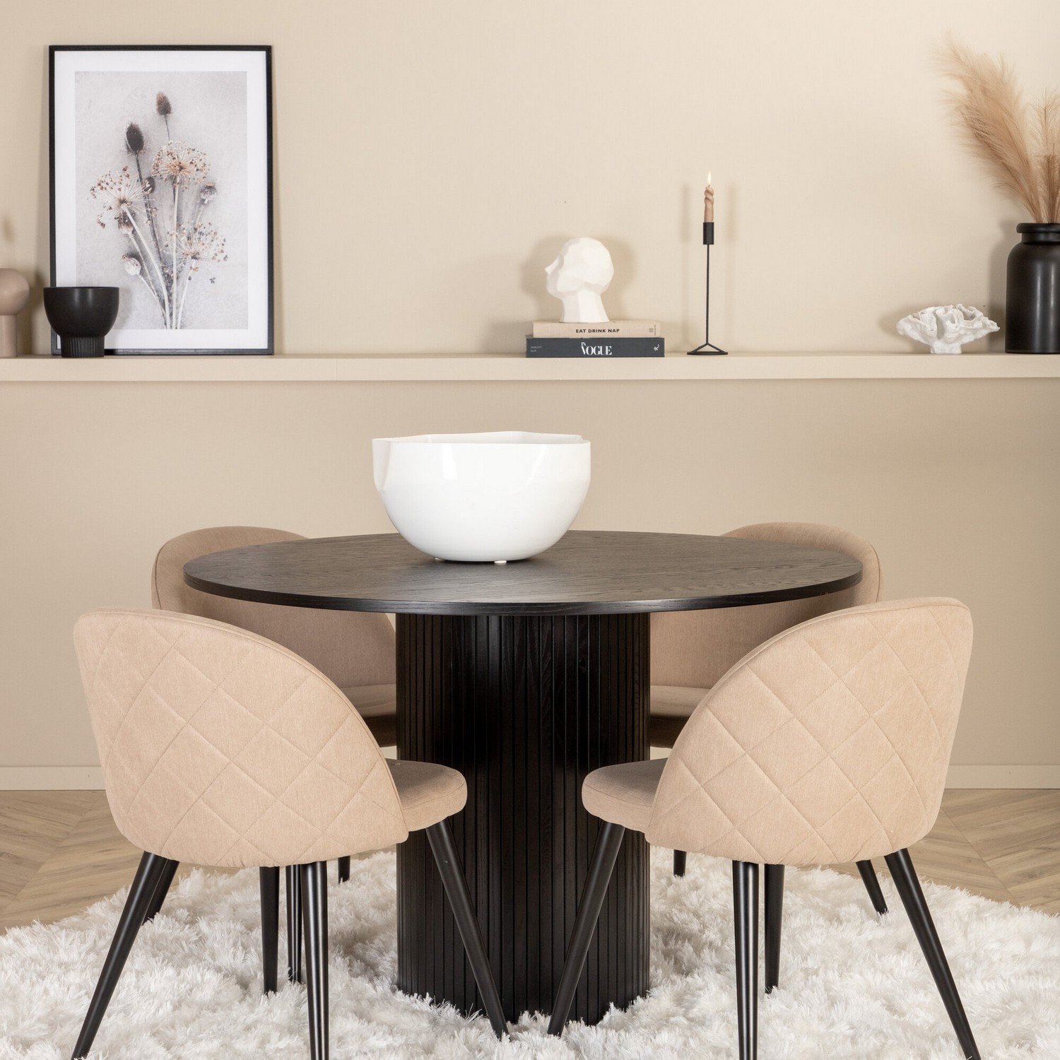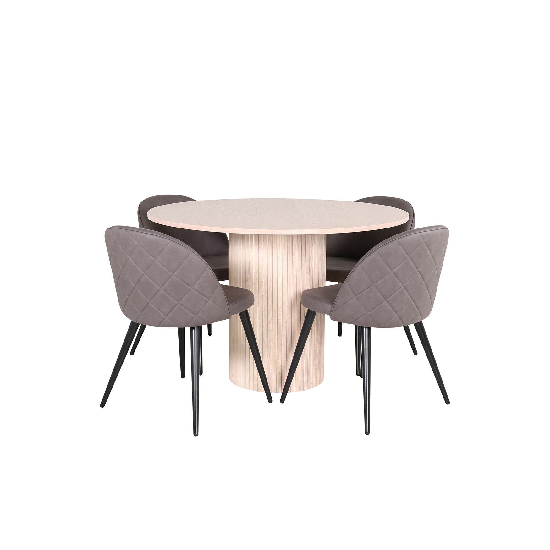 Matgrupp Bianca, med ett runt matbord i MDF med faner med bordsben i trä och MDF. Matchas med 4 st Valentina Stitcthes matstolar med dekorsöm.