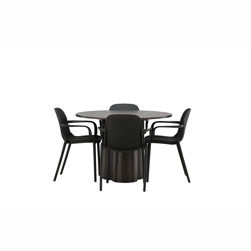 En smakfull och modern matgrupp med alla rätt! Matbord Olivia imponerar med sin Skandinaviska design och smakfulla utformning! Bordet har en genomgående helhetsdesign i MDF med en tunn, rund toppskiva och tre cylinderformade ben som sitter samlat under bordets mitt. Kulören har en lätt täcknad på den fanerade skivan vilket synliggör materialets mönster som ger liv och rörelse till möbeln. Stolen är tillverkad i svart plast som är enkelt att sköta och ger dig en matstol som står sig över tid. Designen är iögonfallande med raka nordiska former och integrerade armstöd för extra komfort!