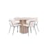 Matgrupp Venture Home Olivia med 4 Chico stolar. En perfekt match - den här matgruppen imponerar! Bordet kommer i en smakfulla kulörer i MDF med en tunn, rund toppskiva och tre cylinderformade ben som sitter samlat under bordets mitt. Stolarna har en minimalistisk och bekväm design med rygg och sits i boucletyg och en smal stomme i stål.