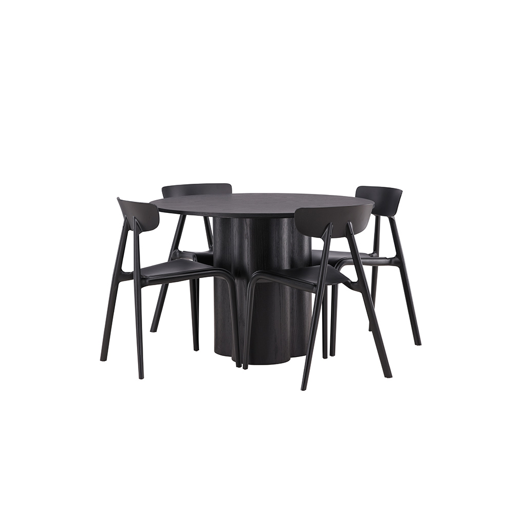 Skapa ett blickfång som imponerar med en modern och lyxig matgrupp! Matbordet från serien Olivia har en genomgående helhetsdesign i MDF med en tunn, rund toppskiva och tre cylinderformade ben som sitter samlade under bordets mitt. Här tillsammans med 4st moderna matstolar från serien Ursholmen. Stolen är genomgående tillverkad i slitstark plast och kommer i en läcker kulör. Stolsryggen har en nätt storlek och sitsen är något djupare. Skapa en konstnärlig känsla och sätt en personlig prägel på inredningen med den här matgruppen!