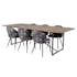 Matgrupp Venture Home Peo med 6 Valentina Stolar är en stilren matgrupp med ett rektangulärt matbord i industriell design med en stomme och ben i svart pulverlackerad metall med en bordsskiva i mörk teak. Det medföljer sex matstolar med en helklädd design, ben i svart pulverlackerad metall samt rundad rygg och sits i polyestertyg. Rygg och sits har mjuk stoppning. Lättare montering krävs.