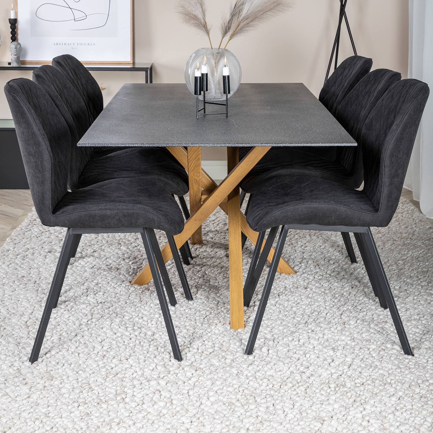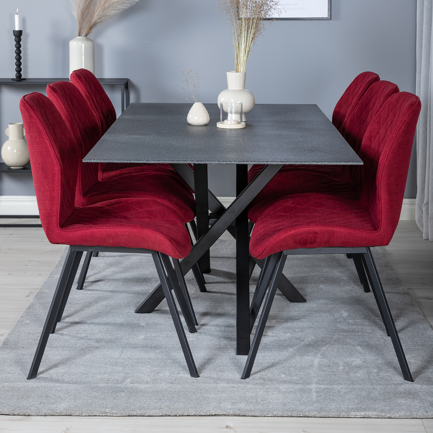 Matgrupp Venture Home Piata med 6 Geneva Stolar Polyestertyg är en modern matgrupp med ett rektangulärt matbord med stilrent underrede i metall och en bordsskiva i sprayglas. Det medföljer sex matstolar i en helklädd exklusiv design med ben i svart pulverlackerad metall. Stolarna har en stoppad rygg och sits i ett skålformat utförande i polyestertyg. De har dessutom en dekorsöm på insidan av rygg och sits som bildar ett snyggt rutmönster. Lättare montering krävs.