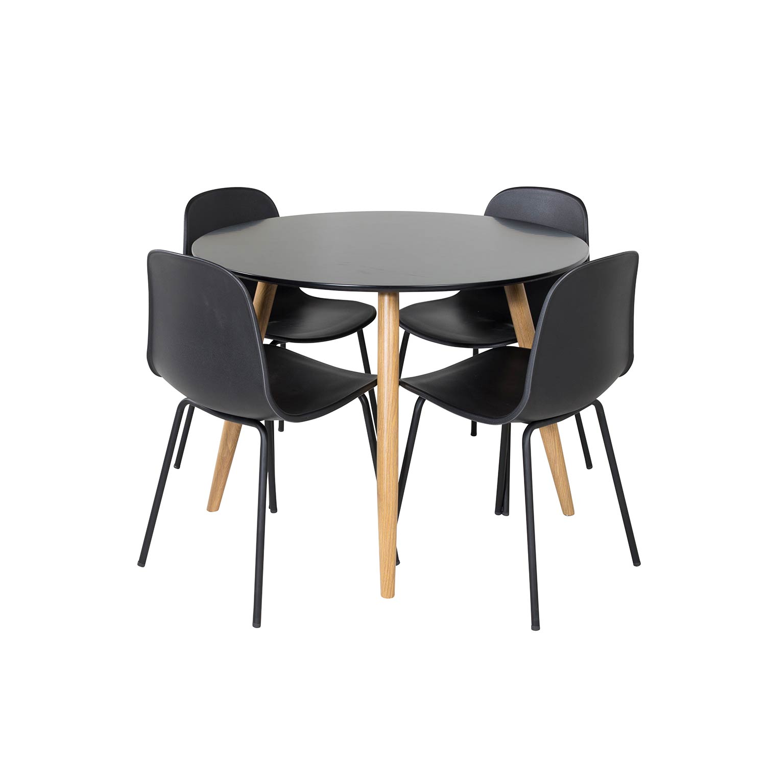 Matgrupp Venture Home Plake med 4 Ardi Stolar Runt är en matgrupp med ett runt matbord med ben i metall och en bordsskiva av MDF. Det medföljer fyra matstolar med stolsben i metall och sitsar i plast.