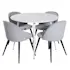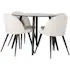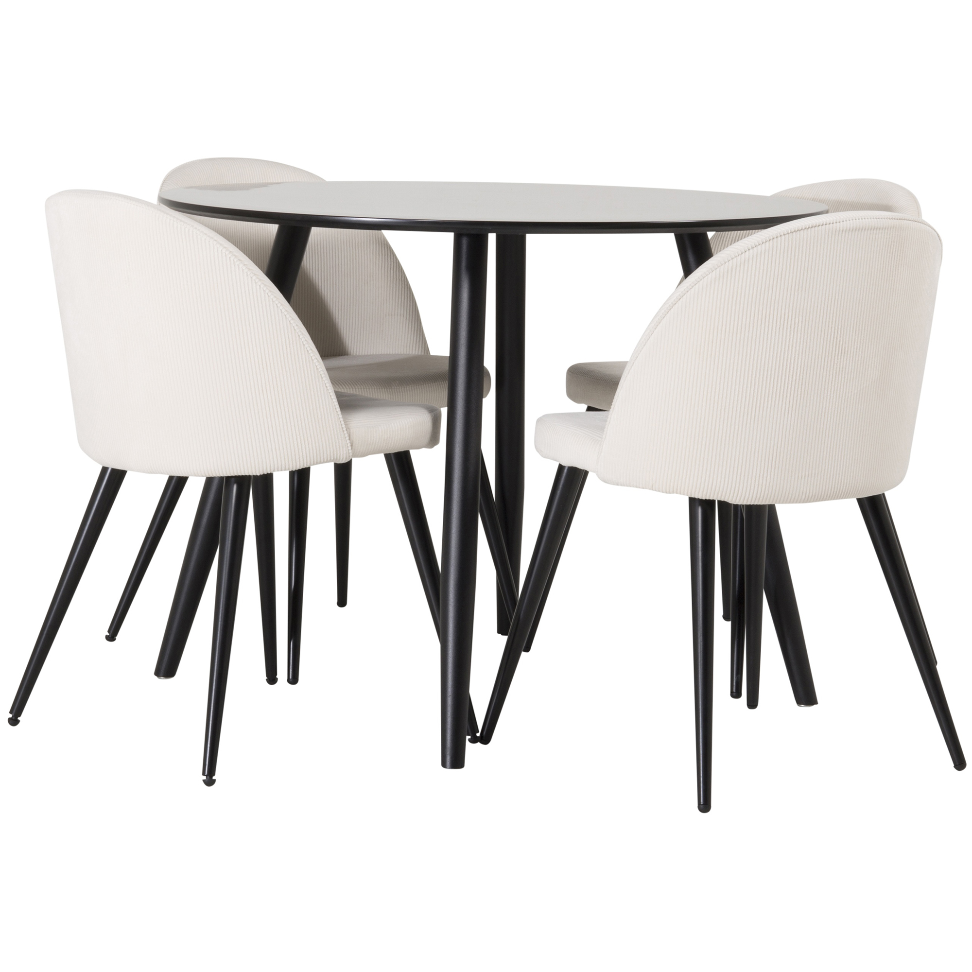 Matgrupp Venture Home Plake med 4 Valentina Stolar Manchester Runt är en matgrupp med ett runt matbord med ben i metall och en bordsskiva av MDF. Det medföljer fyra matstolar med svarta stolsben i metall och sitsar i manchester.