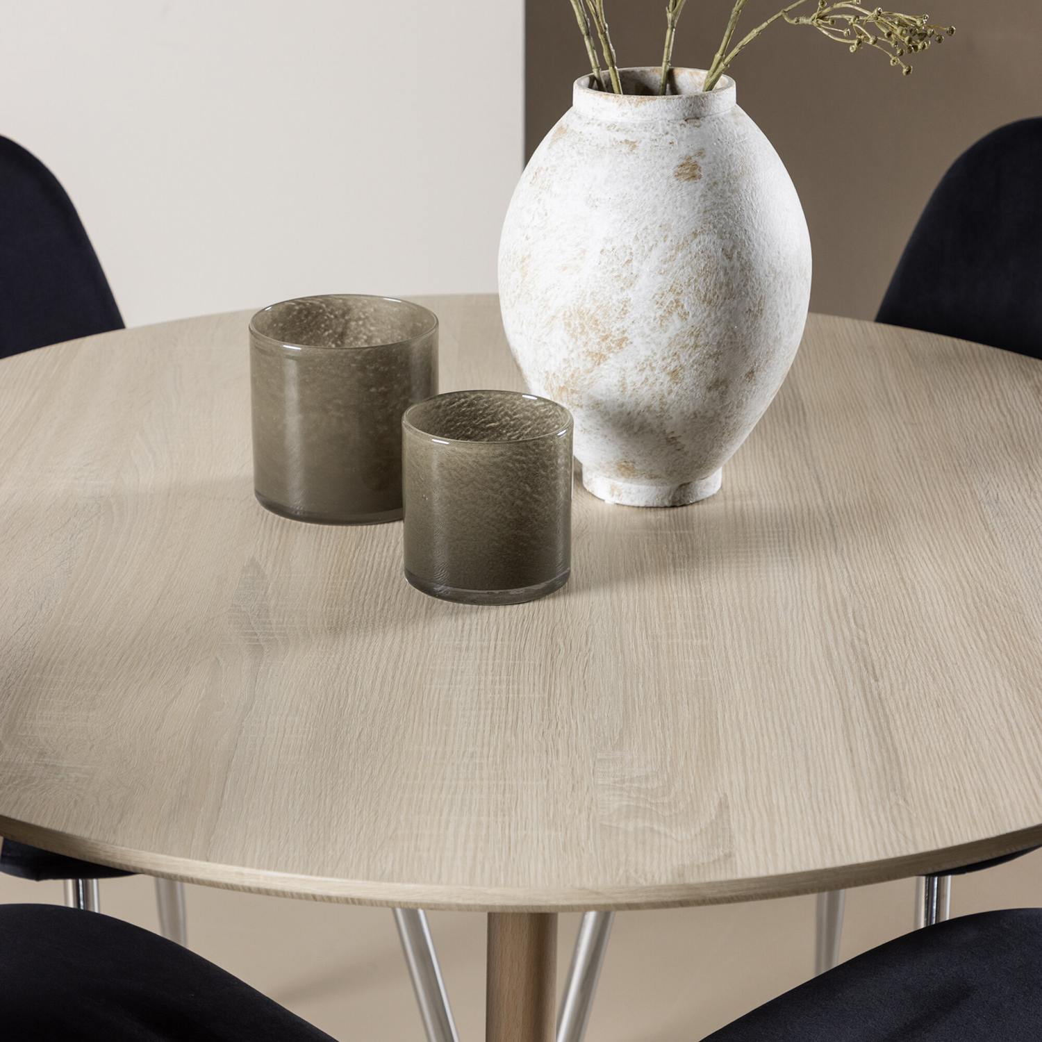 Matbordet Plaza, tillverkat av MDF, har eleganta färger som tillför en modern och stilfull känsla till ditt matrum. Med en diameter på 100 cm erbjuder bordet gott om plats för mat och samtal, samtidigt som dess runda form skapar en harmonisk och inbjudande miljö. Bordets robusta konstruktion säkerställer hållbarhet och stabilitet för långvarig användning.