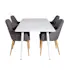 Matgrupp Venture Home Pobbie med 4 Corina Stolar Polyestertyg är en stilren matgrupp med ett rektangulärt matbord med ben i metall med en bordsskiva i MDF. Det medföljer fyra matstolar med stolsben i metall och sitsar i polyester.