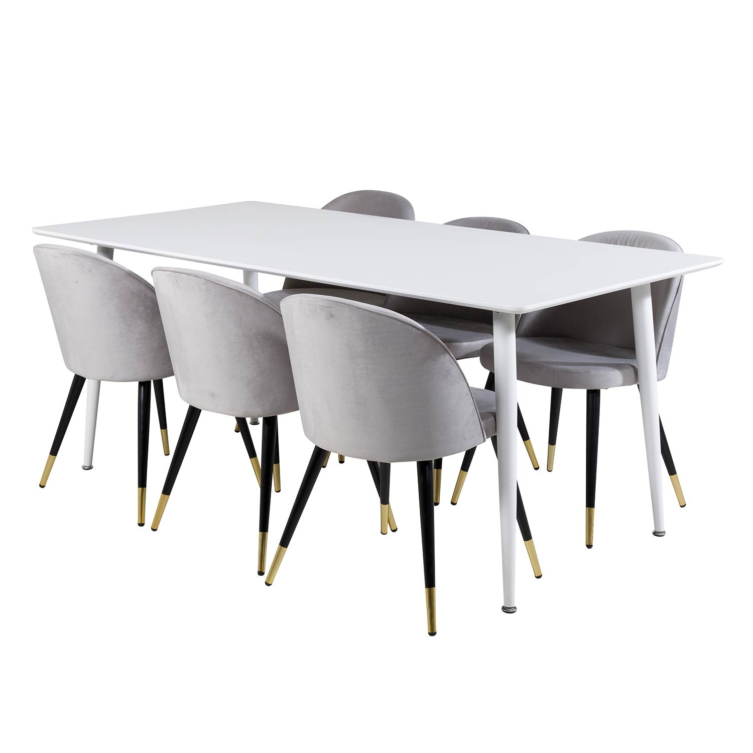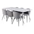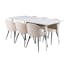 Matgrupp Venture Home Pobbie med 6 Valentina Stolar Sammet är en stilren matgrupp med ett rektangulärt matbord med ben i metall med en bordsskiva i MDF. Det medföljer sex matstolar med svarta stolsben i metall och sitsar i sammet.