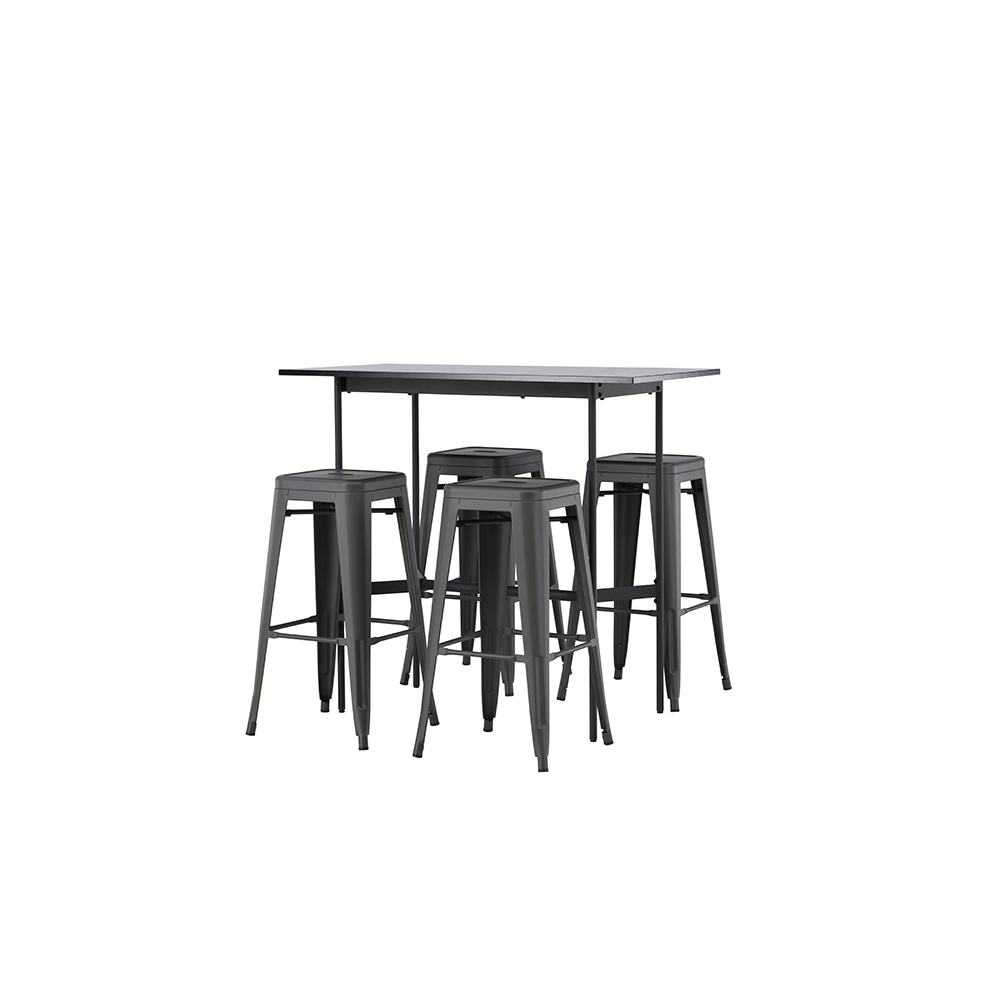 Det minimalistiska barbordet Rax har en tunn bordsskiva i MDF och smala bordsben med integrerat fotstöd i metall. Här i perfekt kombination med barstolar från serien Tempe. Stolen har en klassisk design av en högre pall med lätt utsvängda ben och sits i stål och en ram för fotstöd.