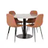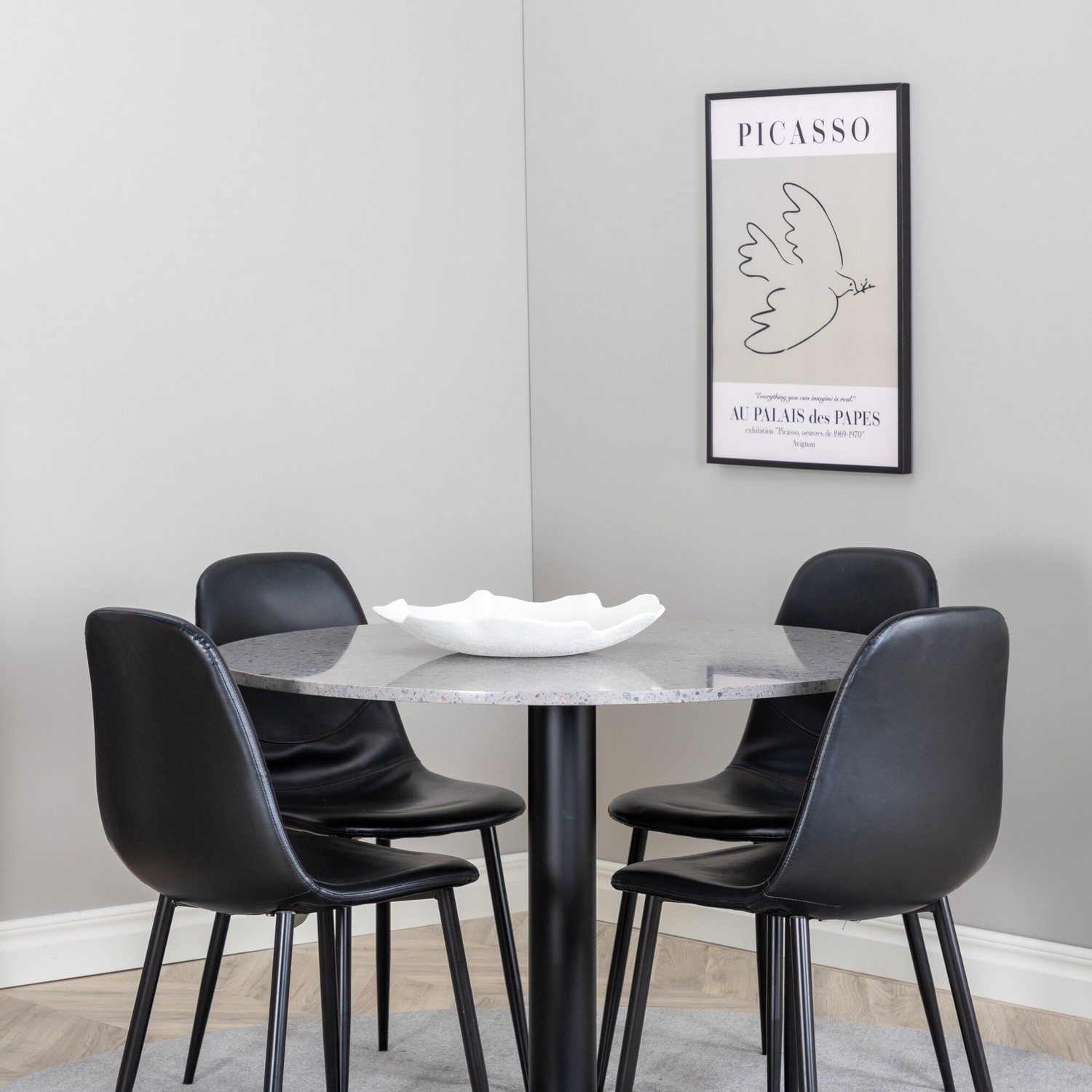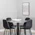 Matgrupp Venture Home Roxanna är en elegant matgrupp med ett runt matbord i grå terazzo bordsskiva och svart underrede i metall tillsammans med fyra stycken Pobbie matstolar i konstgjort läder och stolsben i svart metall.