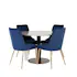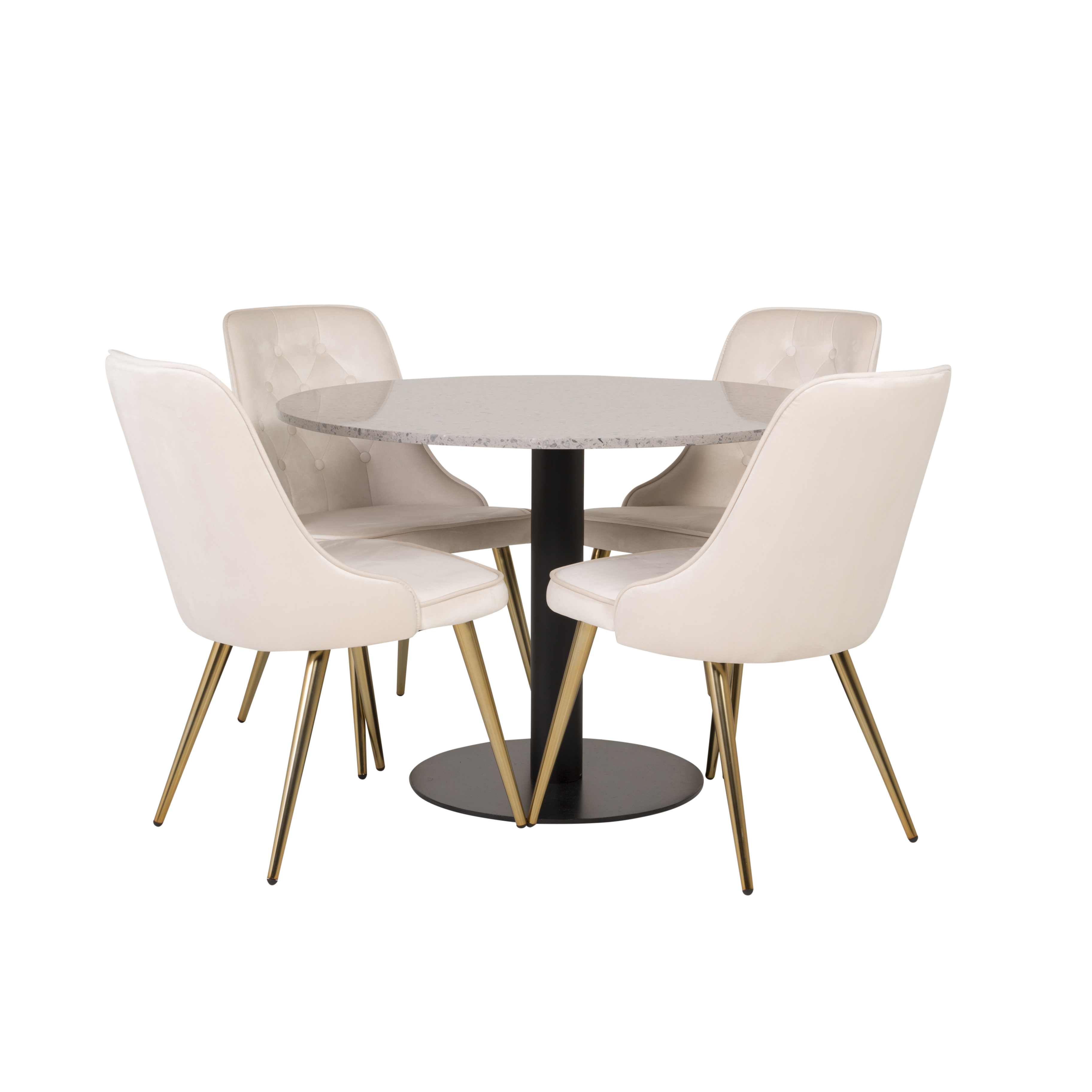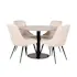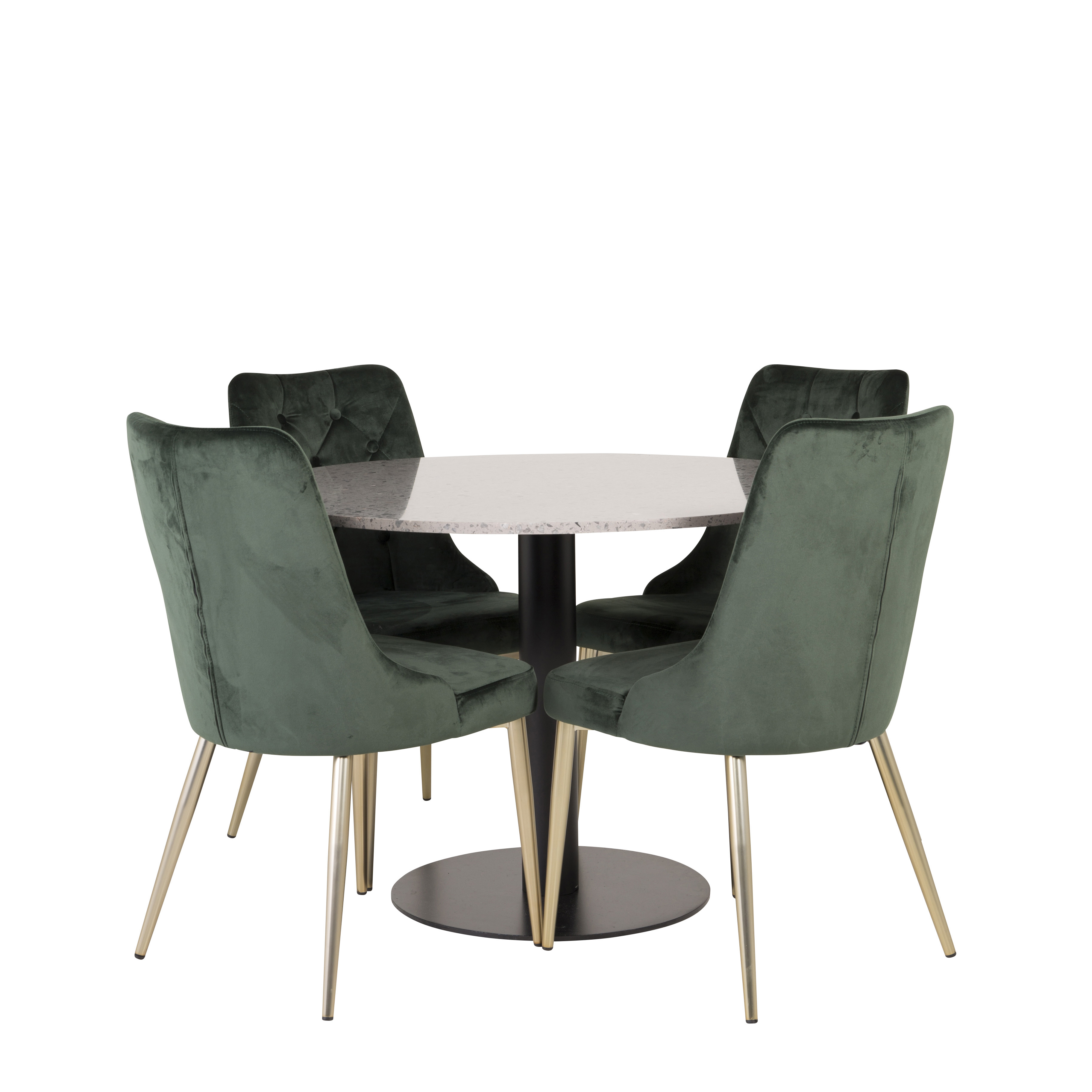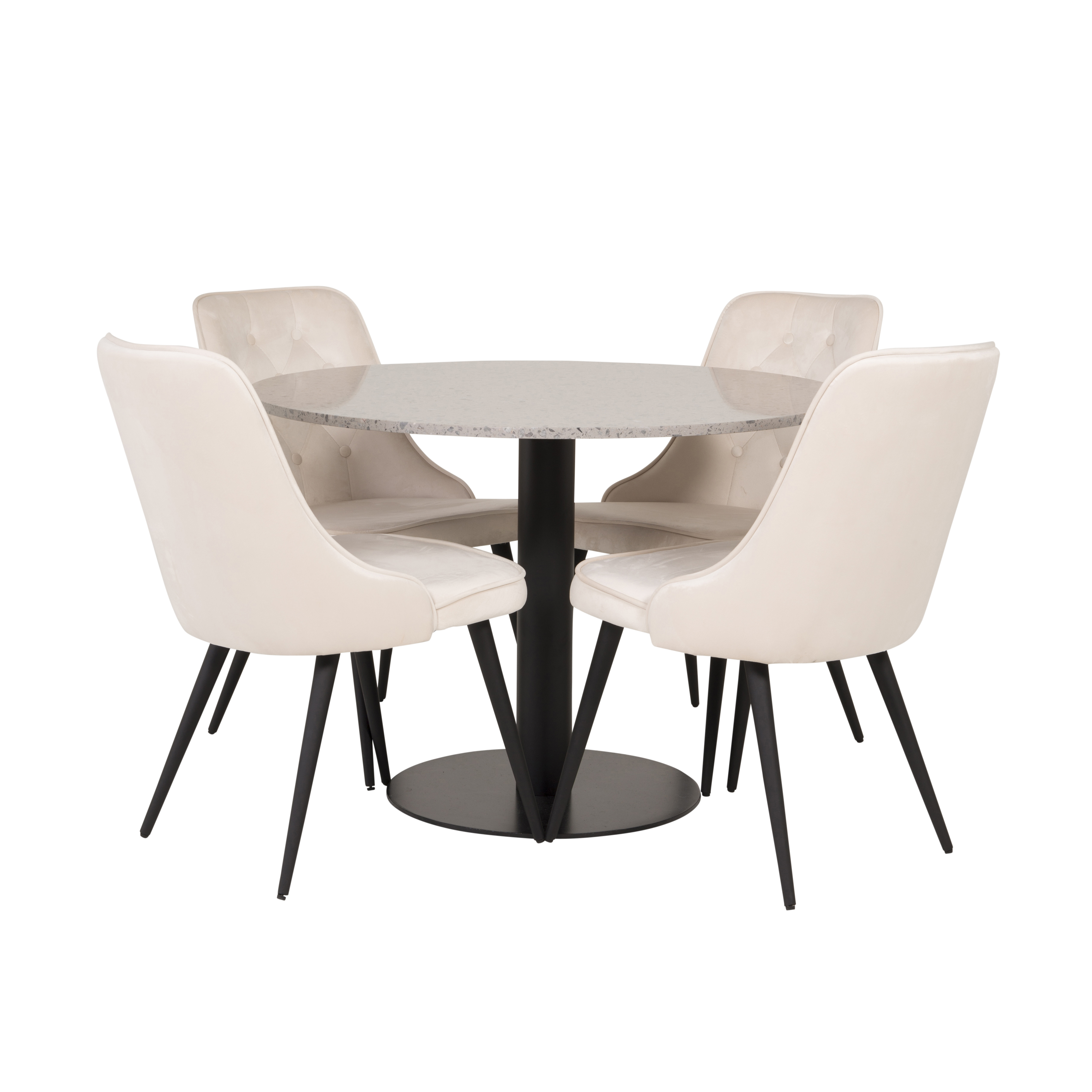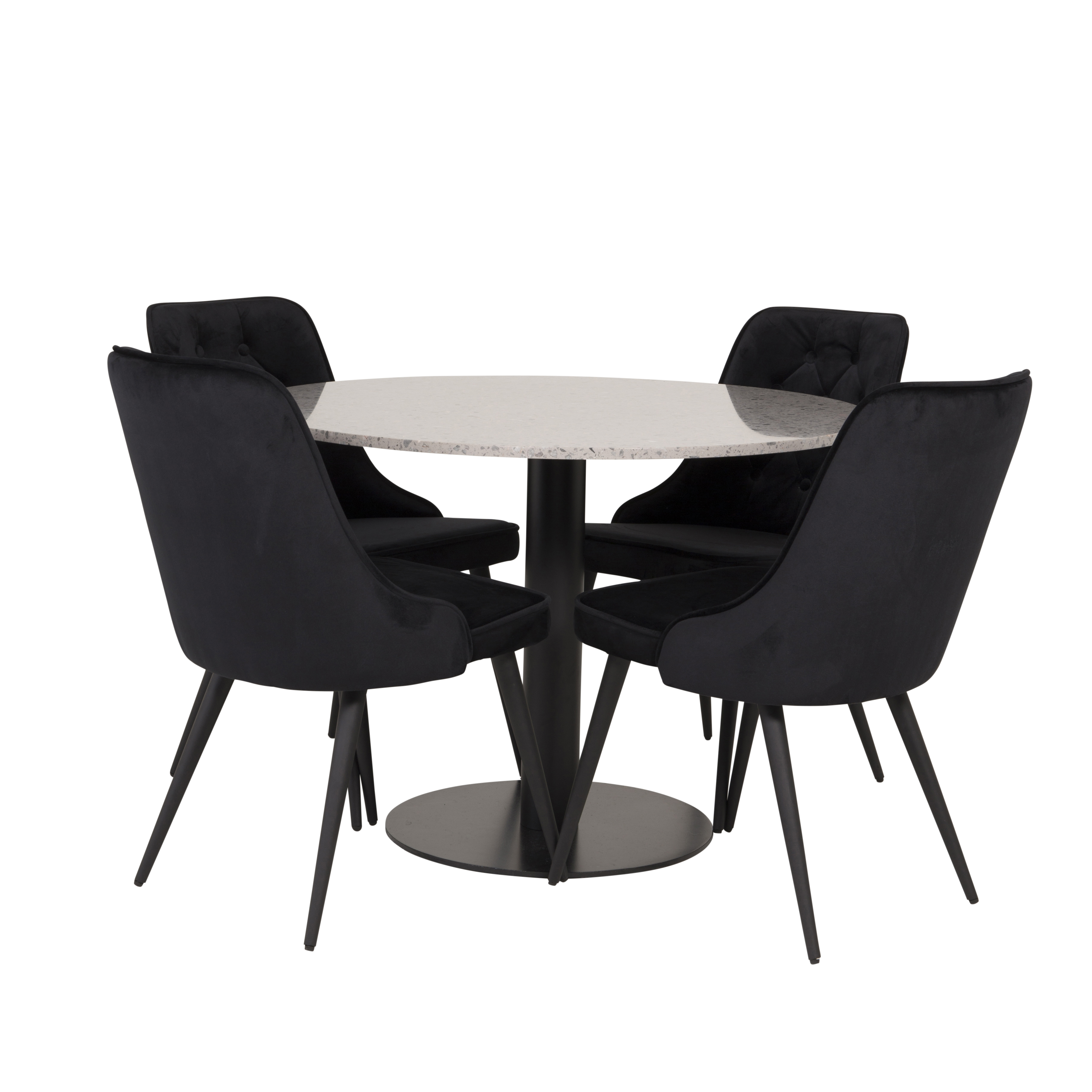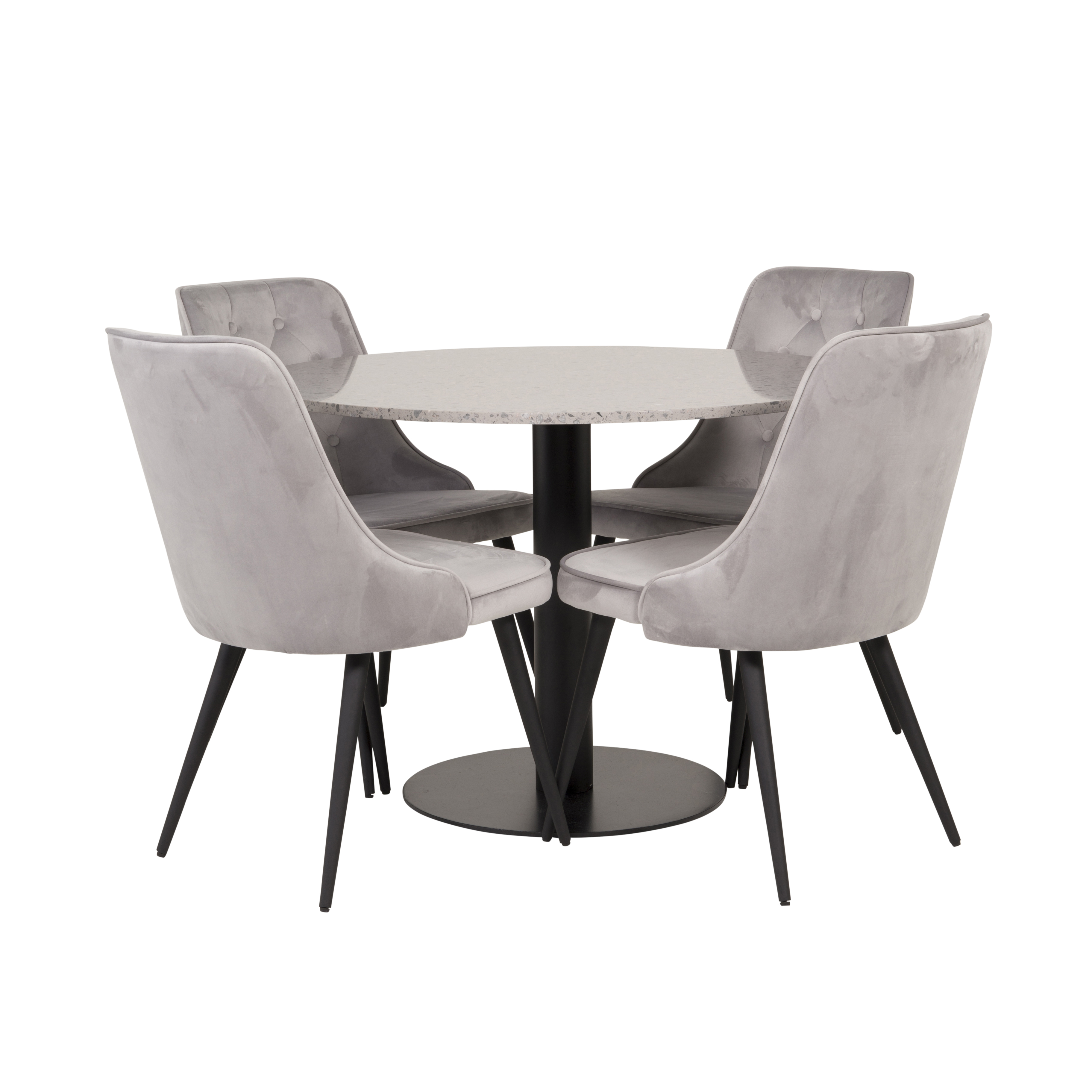 Matgrupp Venture Home Roxanna är en elegant matgrupp med ett runt matbord i grå terazzo bordsskiva och svart underrede i metall tillsammans med fyra stycken Vera matstolar i sammet.