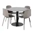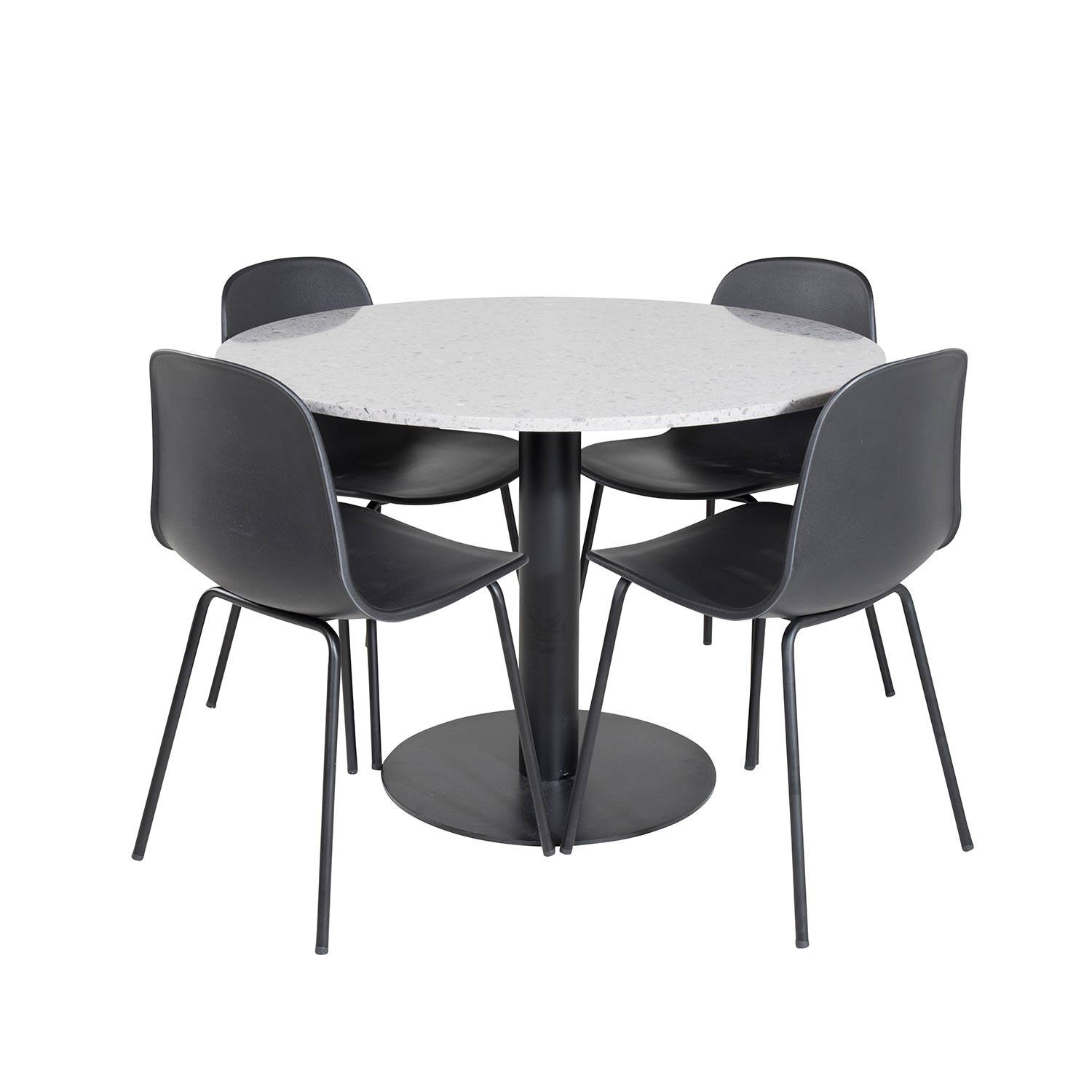 Matgrupp Venture Home Roxanna med 4 Ardi Stolar Runt är en elegant matgrupp med ett runt matbord i stilren, modern design med trumpetfot i pulverlackad metall och en snygg bordsskiva i grå Terrazzo. Det medföljer fyra matstolar med ben i svart pulverlackerad metall. Stolarna har en lätt rundad rygg och sits i helgjuten plast. Lättare montering krävs.