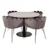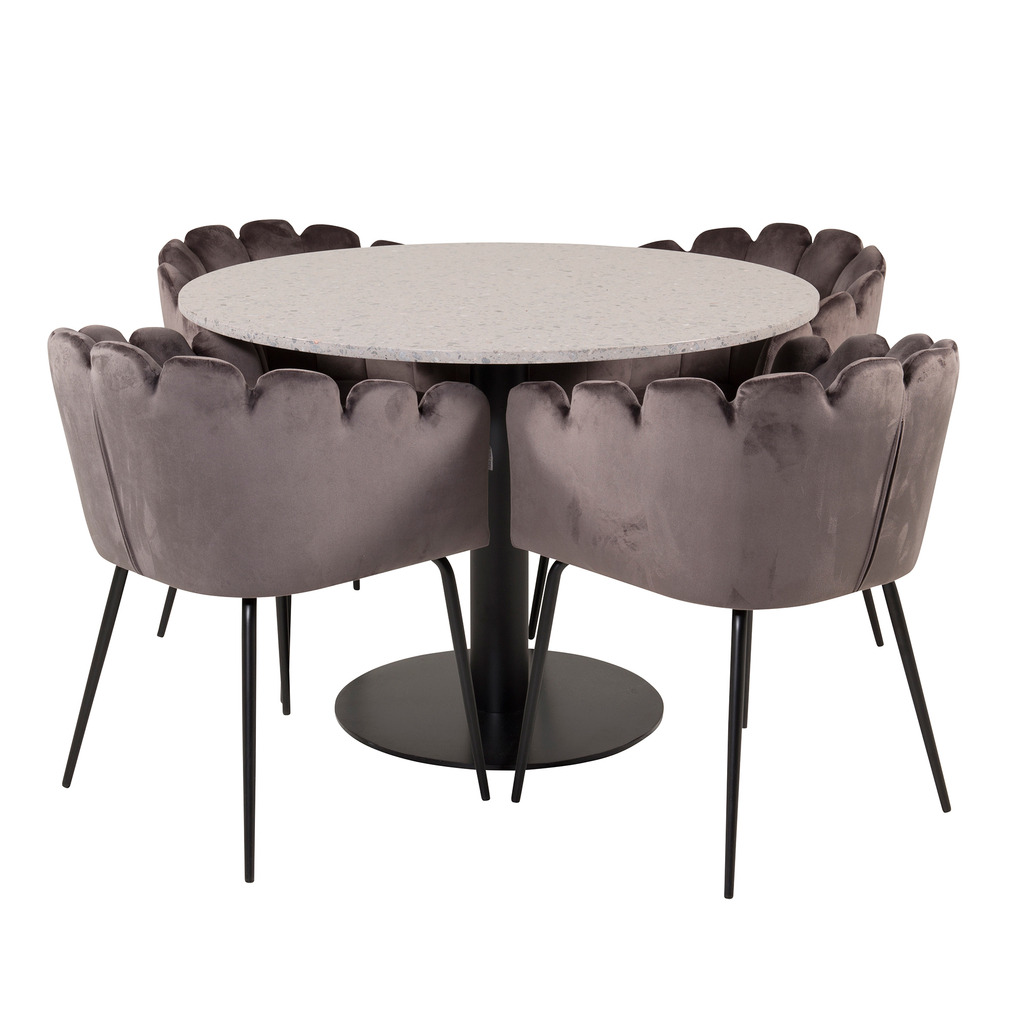 Matgrupp från Furniture Fashion. Runt matbord Roxanna med en rund fot och centrumpelare i svart metall. Bordsskiva i Terazzo. Matstolar Limhamn med stomme och ben i svart metall. Låg rygg i en exklusivt utformad design. Ryggen och sitsen är i grå sammet. Lättare montering krävs.