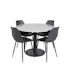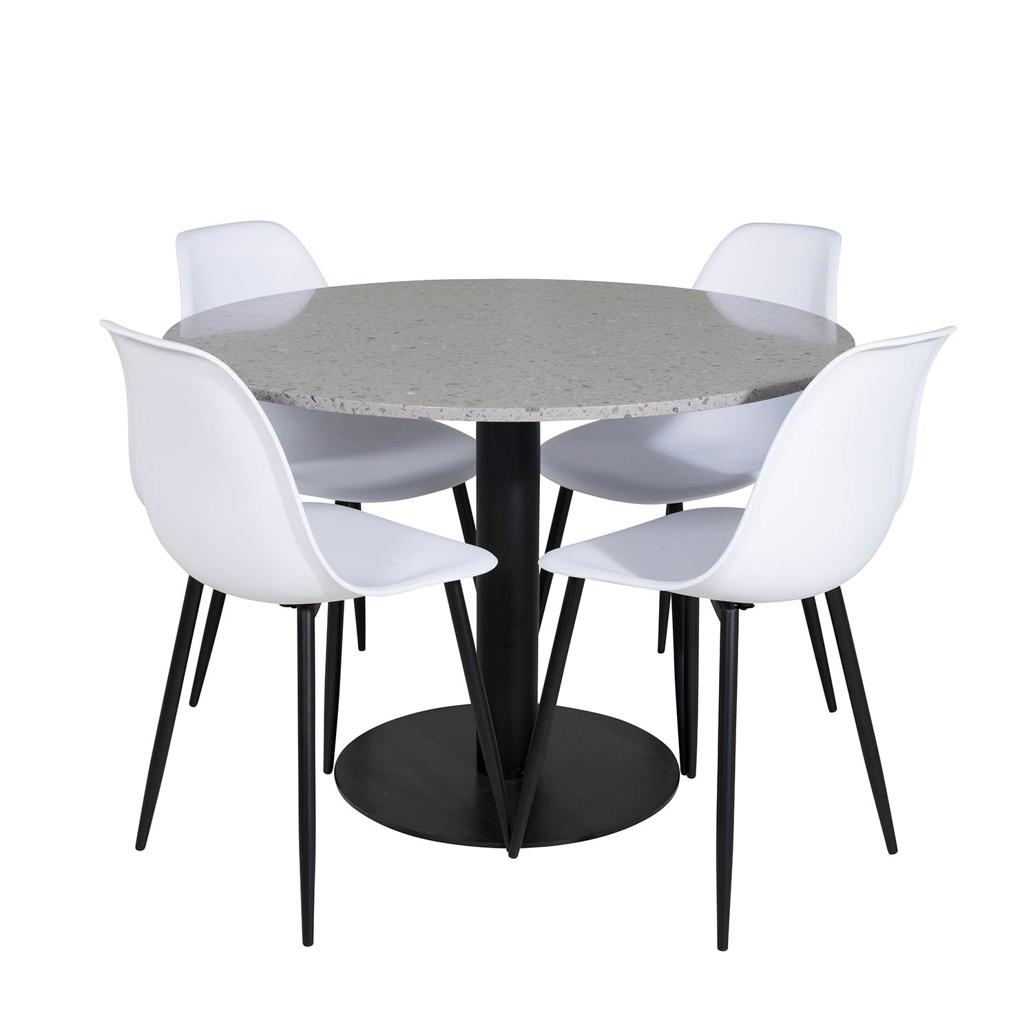 Matgrupp Venture Home Roxanna med 4 Pop Stolar Runt är en elegant matgrupp med ett runt matbord i stilren, modern design med trumpetfot i pulverlackad metall och en snygg bordsskiva i grå Terrazzo. Det medföljer fyra matstolar i modern design med ben i svart pulverlackerad metall. Stolarna har en skålformad rundad rygg och sits i helgjuten plast. Lättare montering krävs.