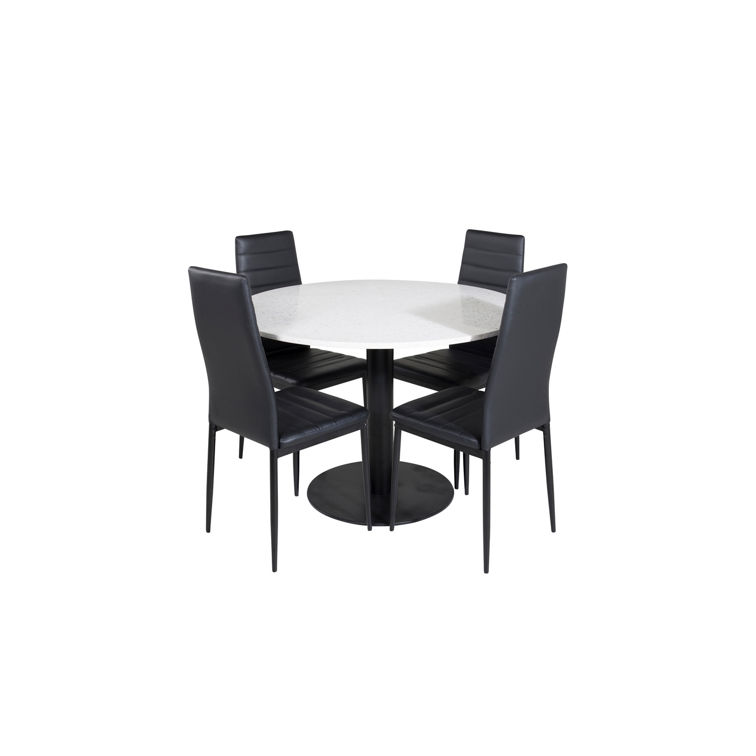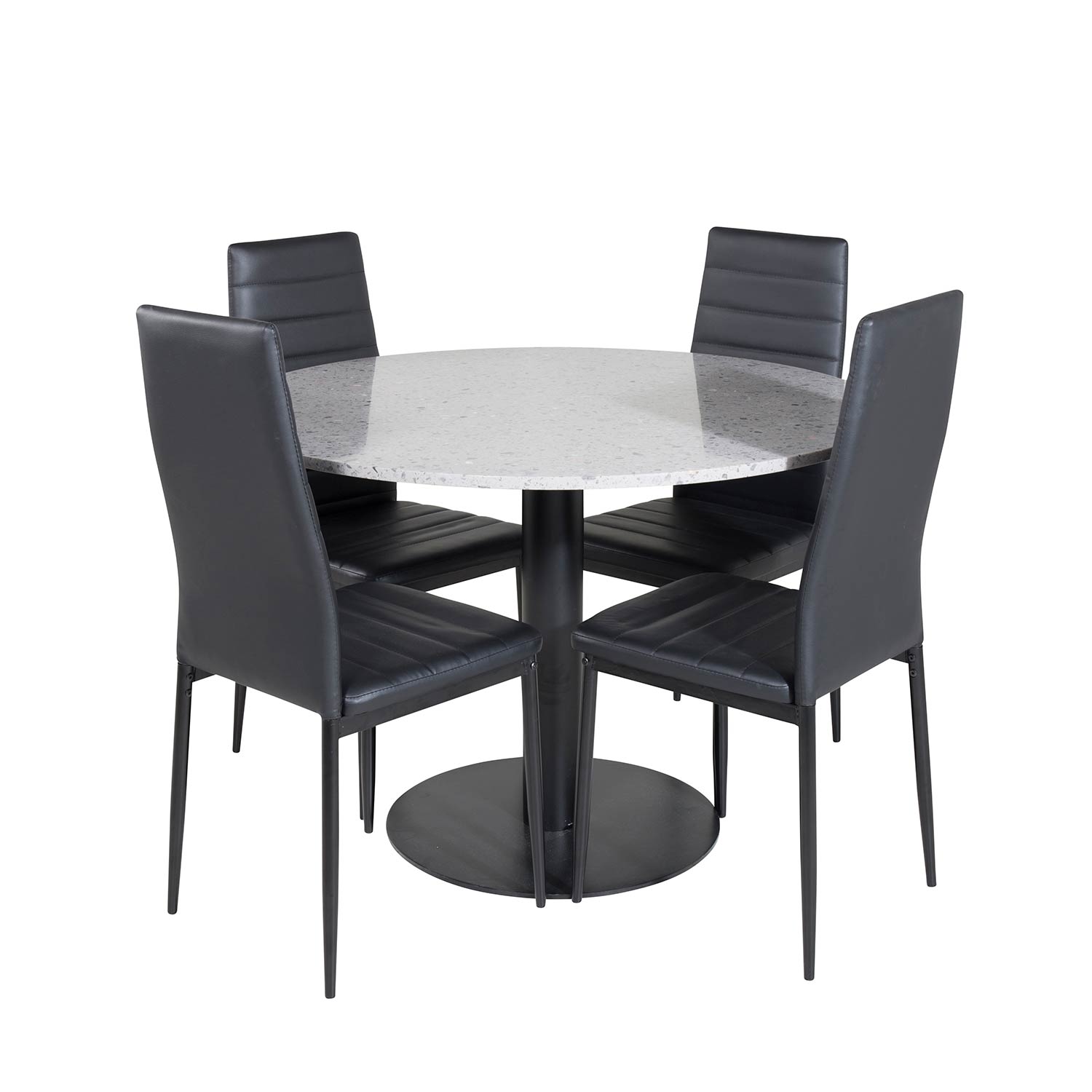 Matgrupp Venture Home Roxanna med 4 Sly Stolar Runt är en elegant matgrupp med ett runt matbord i stilren, modern design med trumpetfot i pulverlackad metall och en snygg bordsskiva i grå Terrazzo. Det medföljer fyra matstolar i helklädd, modern design. Stolarna har ben i svart pulverlackerad metall och en rygg och sits i konstläder med dekorsömmar på insidan av rygg och sits som bildar ett randigt mönster. Lättare montering krävs.