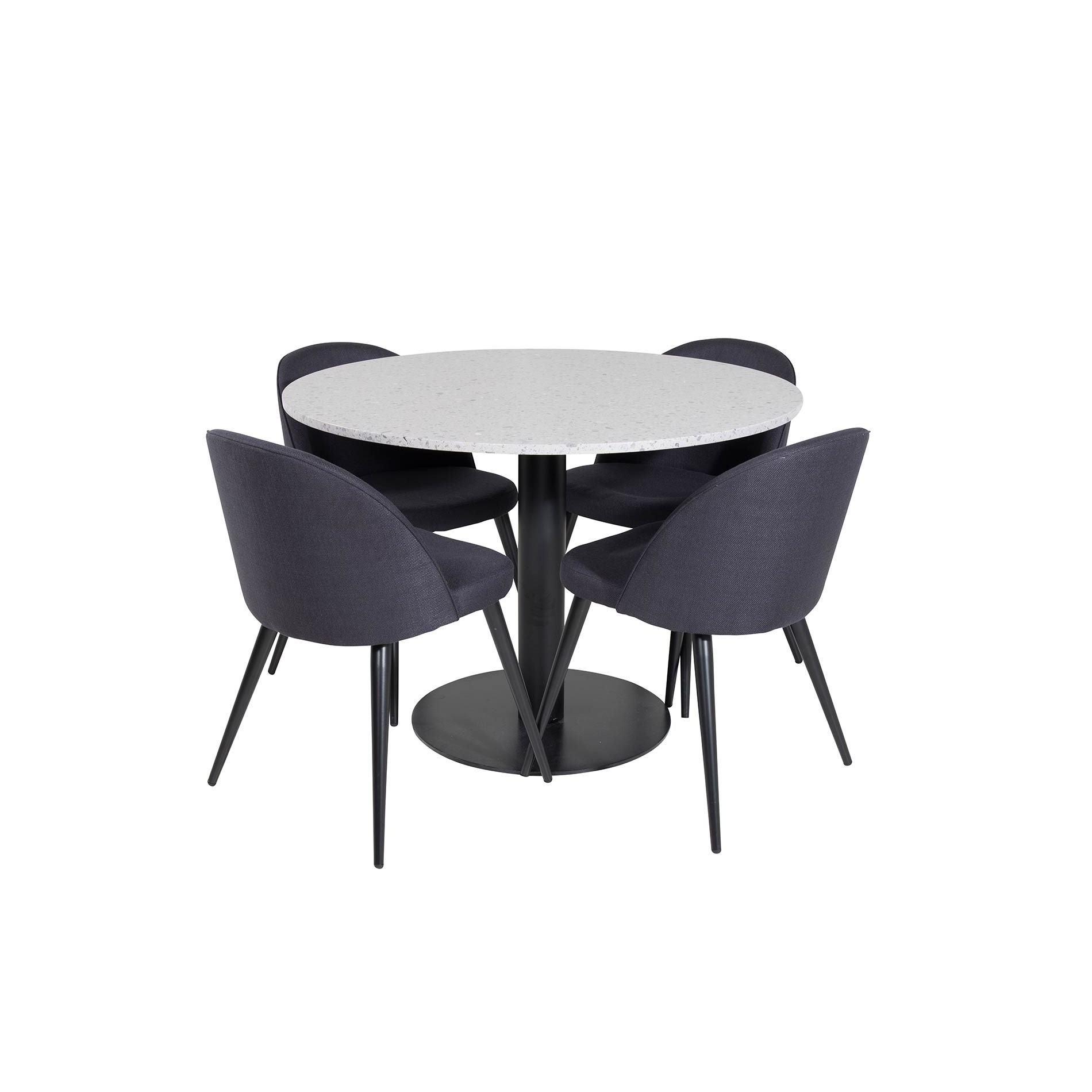Matgrupp Venture Home Roxanna med 4 Valentina Stolar Polyestertyg Runt är en elegant matgrupp med ett runt matbord i stilren, modern design med trumpetfot i pulverlackad metall och en snygg bordsskiva i grå Terrazzo. Det medföljer fyra matstolar med en helklädd design, ben i svart pulverlackerad metall samt rundad rygg och sits i polyestertyg. Rygg och sits har mjuk stoppning. Lättare montering krävs.