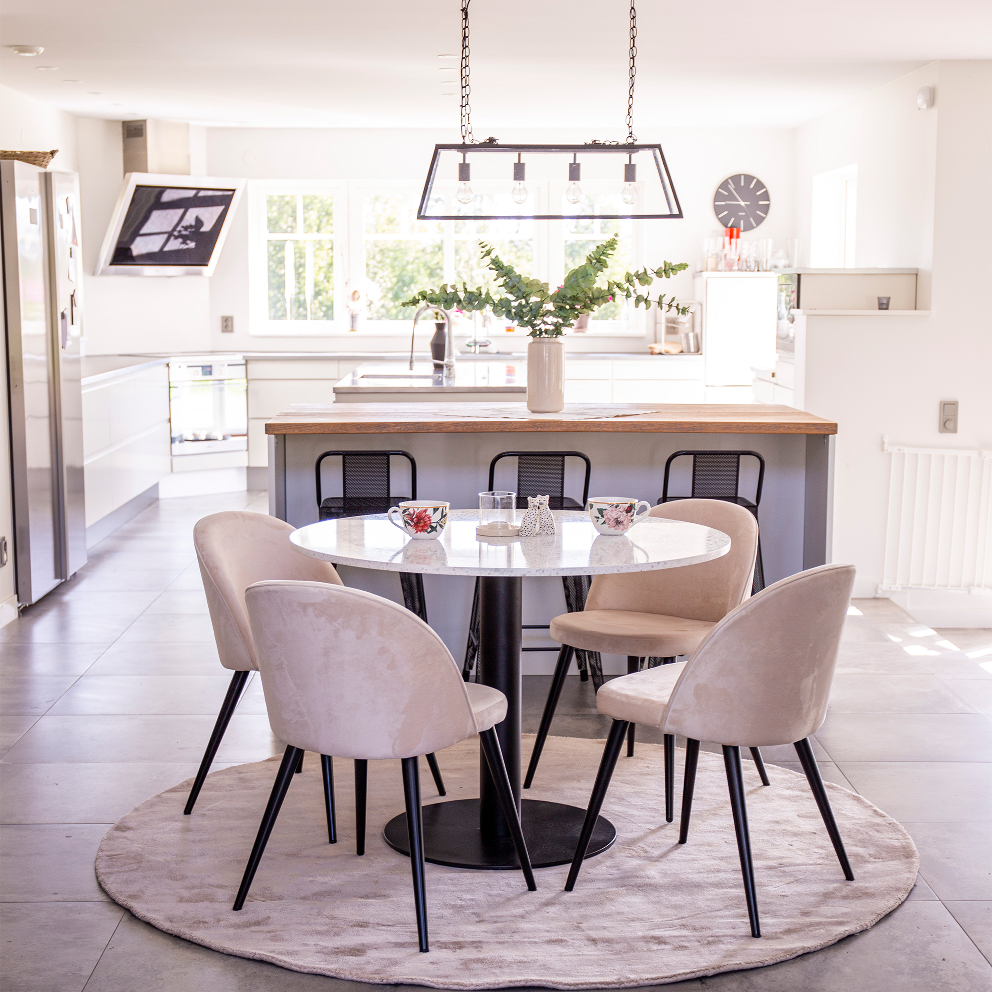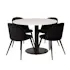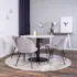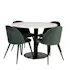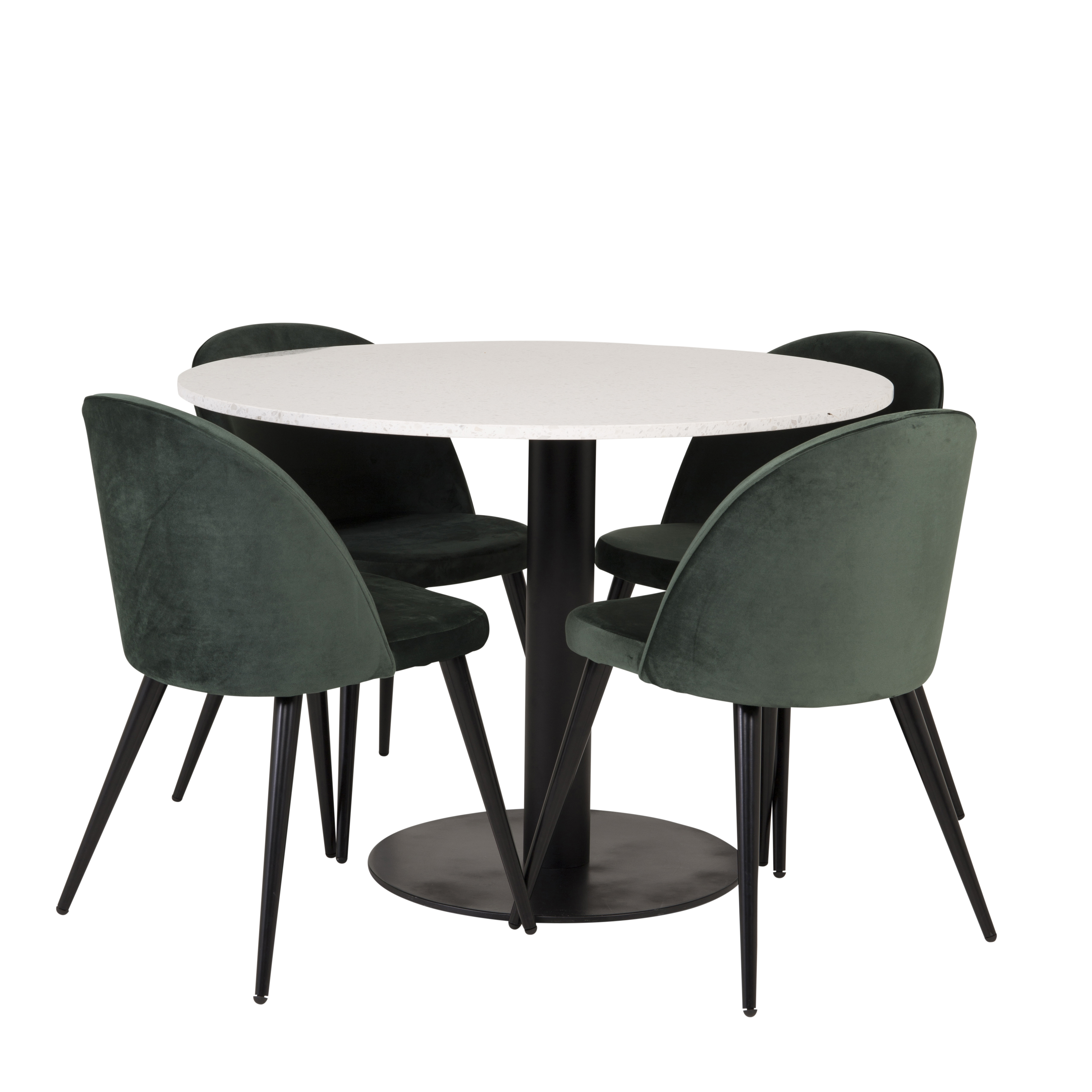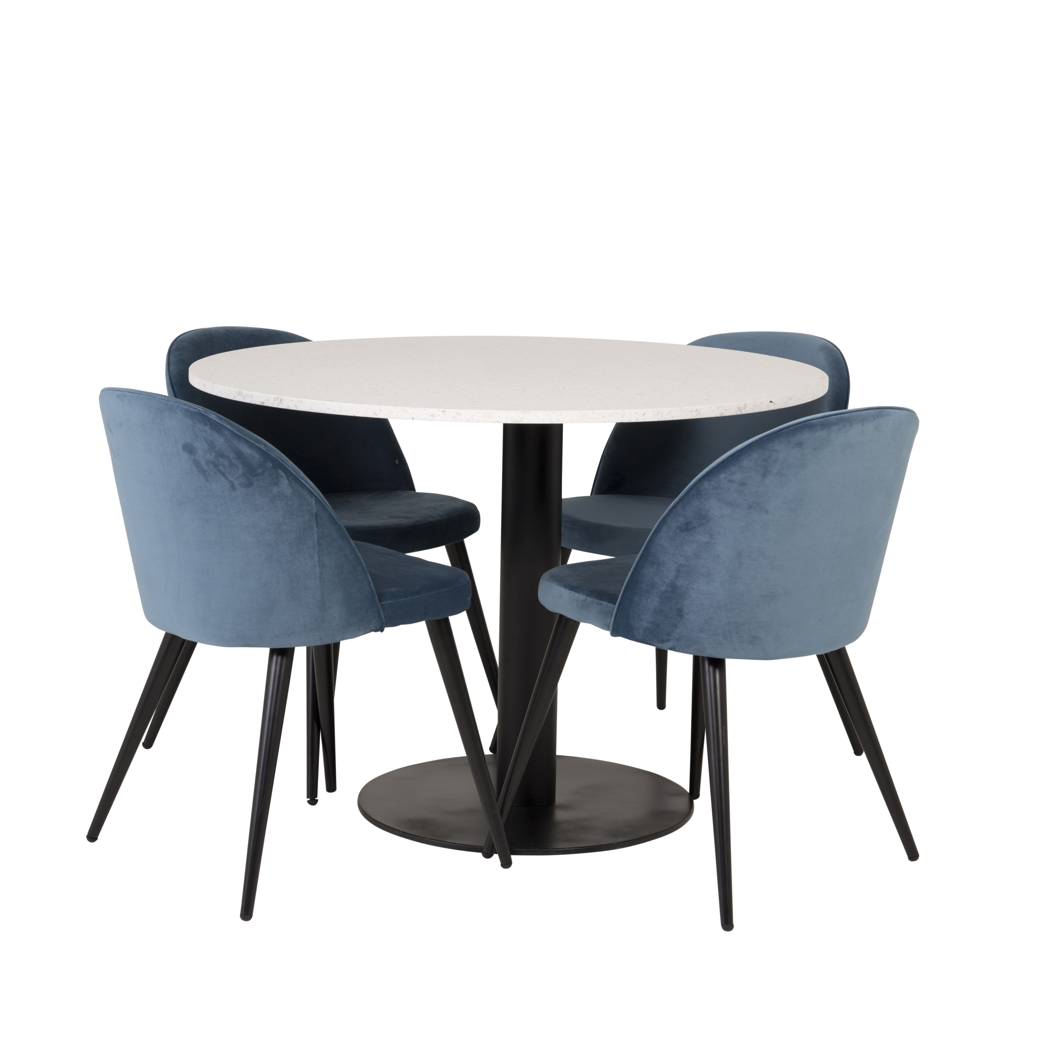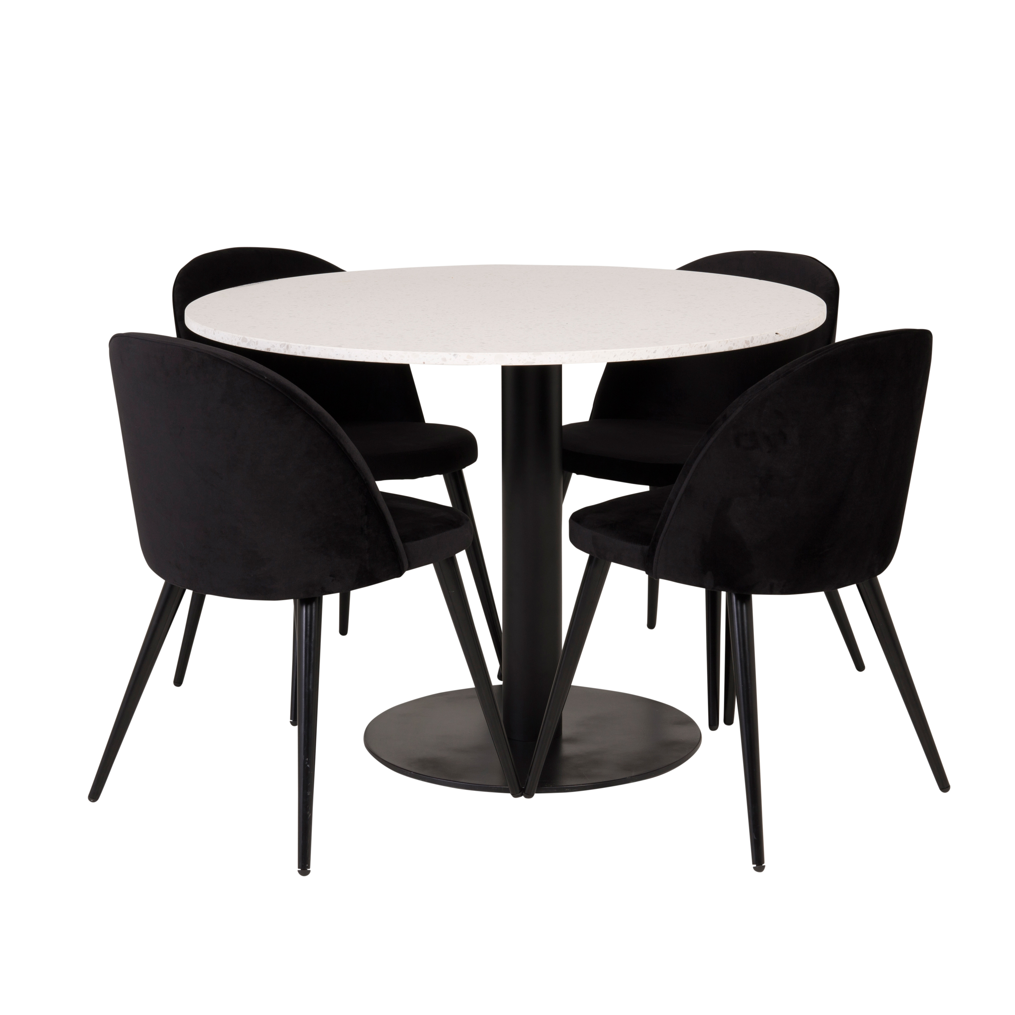 Matgrupp Venture Home Roxanna är en elegant matgrupp med ett runt matbord i vit terazzo bordsskiva och svart underrede i metall tillsammans med fyra stycken Valentina matstolar i sammet.