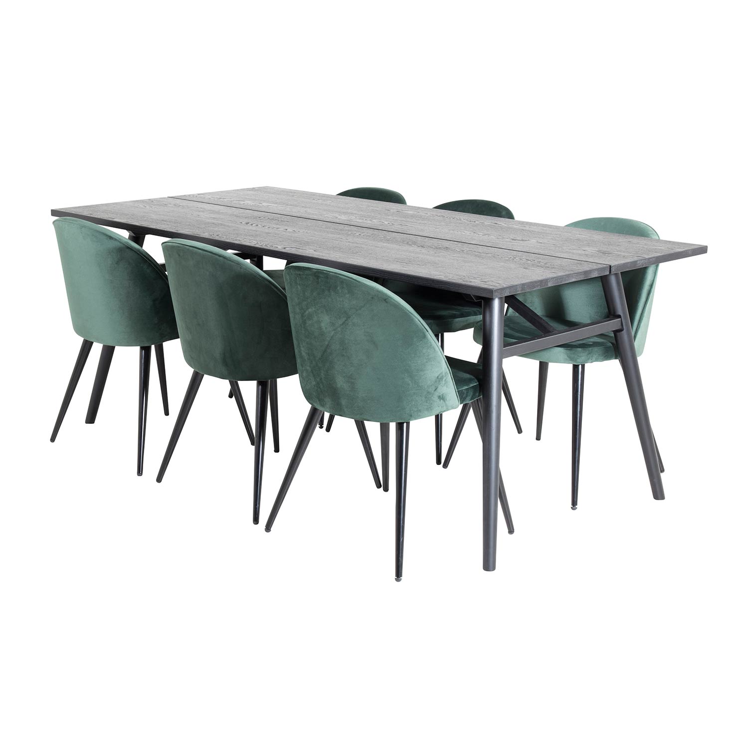 Matgrupp Venture Home Salt med 6 Valentina Stolar Sammet är en stilren matgrupp med ett rektangulärt matbord med en stomme och ben i svart pulverlackerad metall med en bordsskiva designad i två delar, i lättborstad svart ekfanér med en kärna av MDF. Bordet kan kompletteras med en iläggsskiva, den ingår ej. Det medföljer sex matstolar med en helklädd design, ben i svart pulverlackerad metall samt rundad rygg och sits i sammetstyg. Rygg och sits har mjuk stoppning. Lättare montering krävs.