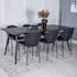 Matgrupp Venture Home Salt med 6 Valor Stolar är en stilren matgrupp med ett rektangulärt matbord med en stomme och ben i svart pulverlackerad metall med en bordsskiva designad i två delar, i lättborstad svart ekfanér med en kärna av MDF. Bordet kan kompletteras med en iläggsskiva, den ingår ej. Det medföljer sex matstolar med en stomme och ben i svart pulverlackerad metall, i en snygg design med rund rygg. Stolarna har en rygg och sits i stoppat polyestertyg. Lättare montering krävs.