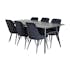 Matgrupp Venture Home Salt med 6 Vera Stolar Sammet är en stilren matgrupp med ett rektangulärt matbord med en stomme och ben i svart pulverlackerad metall med en bordsskiva designad i två delar, i lättborstad svart ekfanér med en kärna av MDF. Bordet kan kompletteras med en iläggsskiva, den ingår ej. Det medföljer sex matstolar i helklädd design med ben i svart pulverlackerad metall. Stolarna har en rygg med knappar och dekorsöm samt rygg och sits i sammetstyg med mjuk stoppning. Lättare montering krävs.