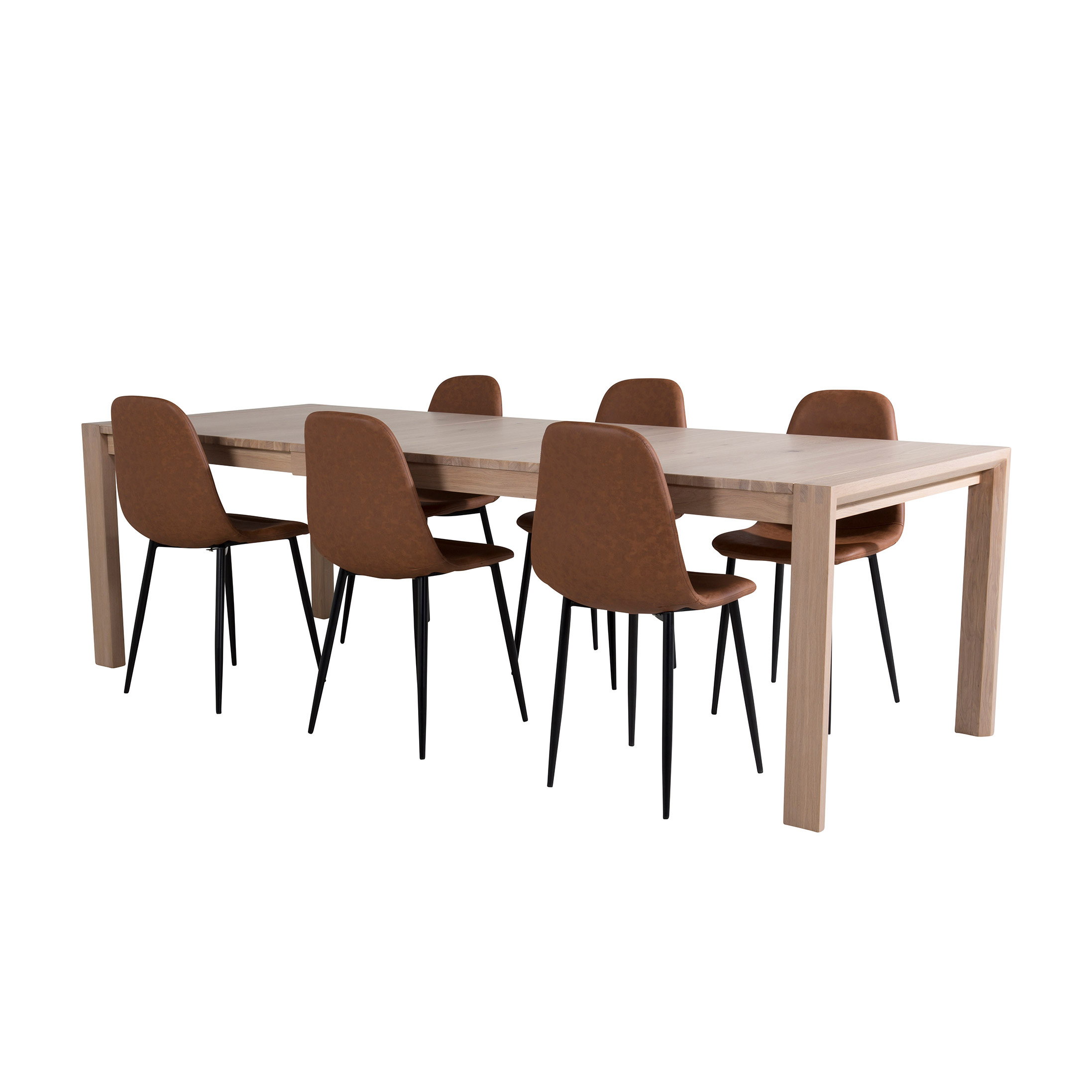 Matgrupp Shy, med ett förlängningsbart matbord och bordsben i ek. Matchas med 6 st Pobbie matstolar med svarta stolsben i metall och bruna sitsar i konstläder.