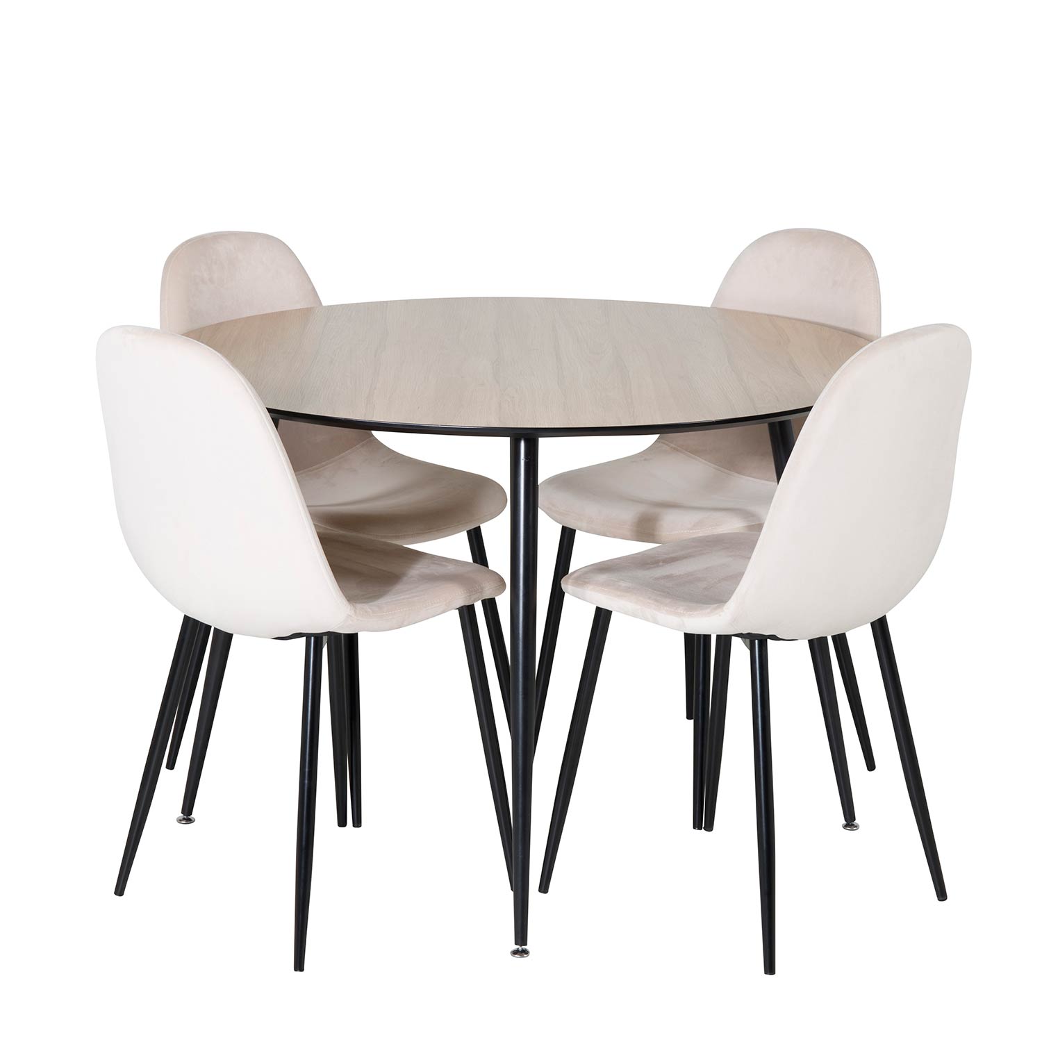 Matgrupp Venture Home Silvia med 4 Pobbie Stolar Runt är en modern matgrupp med ett runt matbord i MDF och svarta bordsben i metall. Det medföljer fyra matstolar med svarta stolsben i metall och sitsar i sammet.