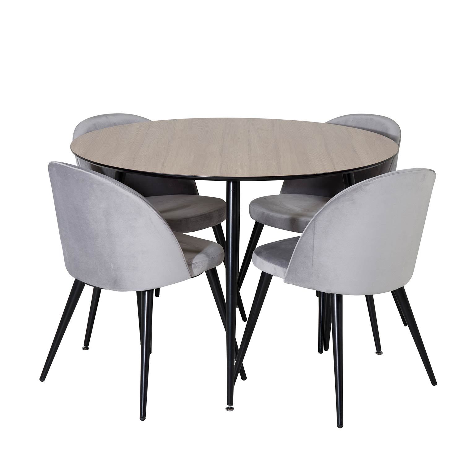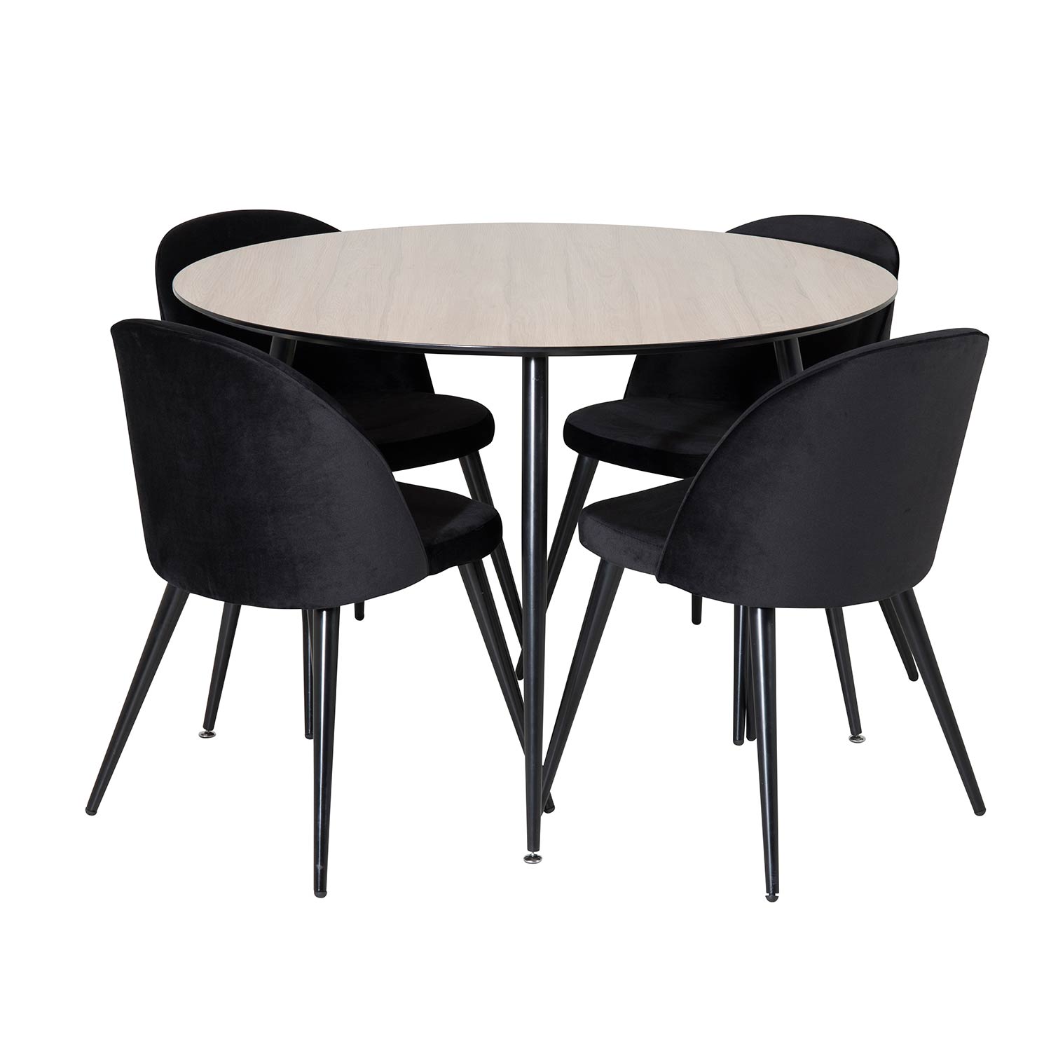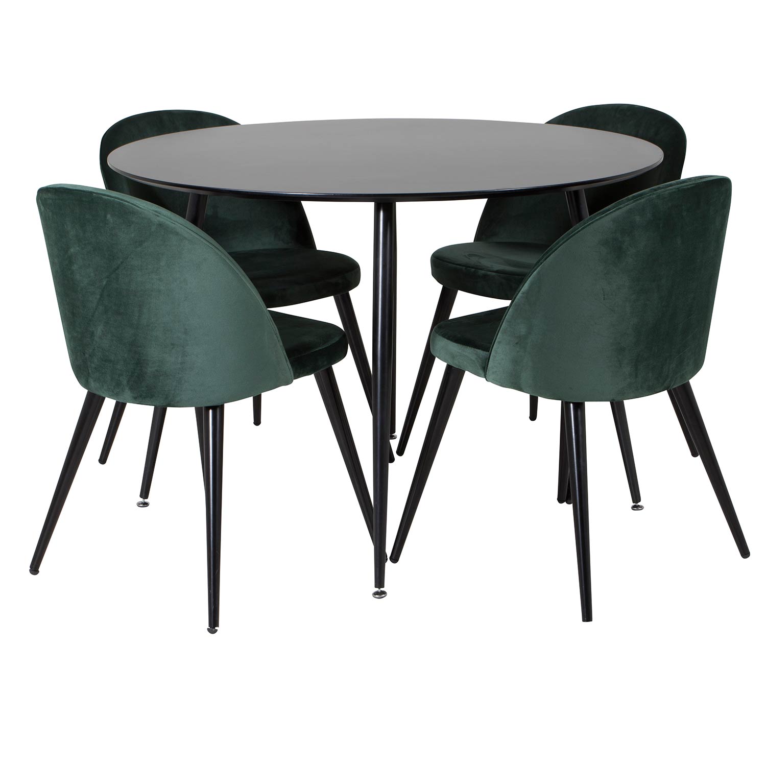 Matgrupp Venture Home Silvia med 4 Valentina Stolar Sammet Runt är en stilren matgrupp med ett runt matbord i MDF och svarta bordsben i metall. Det medföljer fyra matstolar med svarta stolsben i metall och sitsar i sammet.