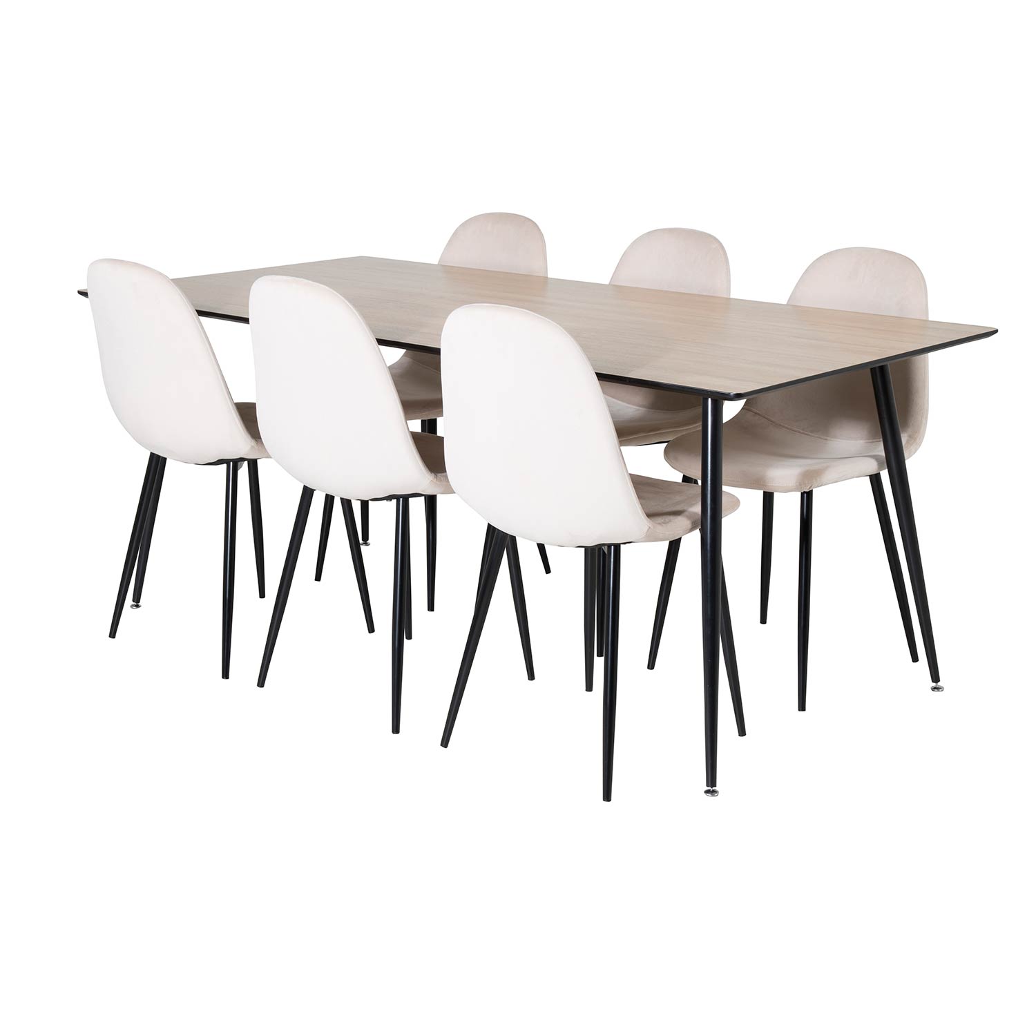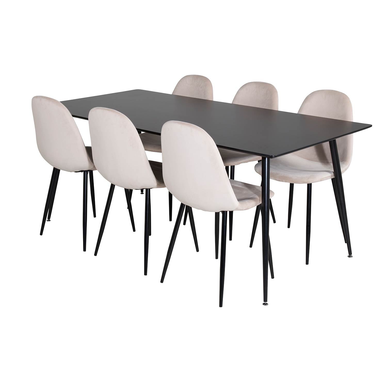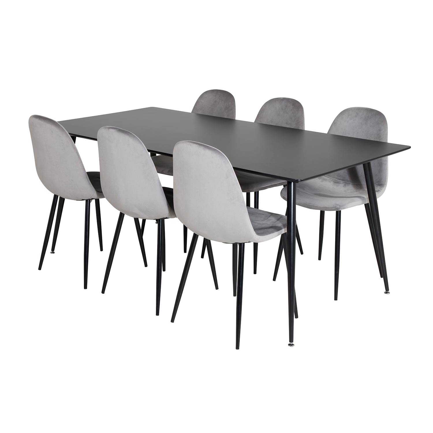 Matgrupp Venture Home Silvia med 6 Pobbie Stolar Sammet är en stilren matgrupp med ett matbord i MDF och svarta bordsben i metall. Det medföljer sex matstolar med svarta stolsben i metall och sitsar i sammet.
