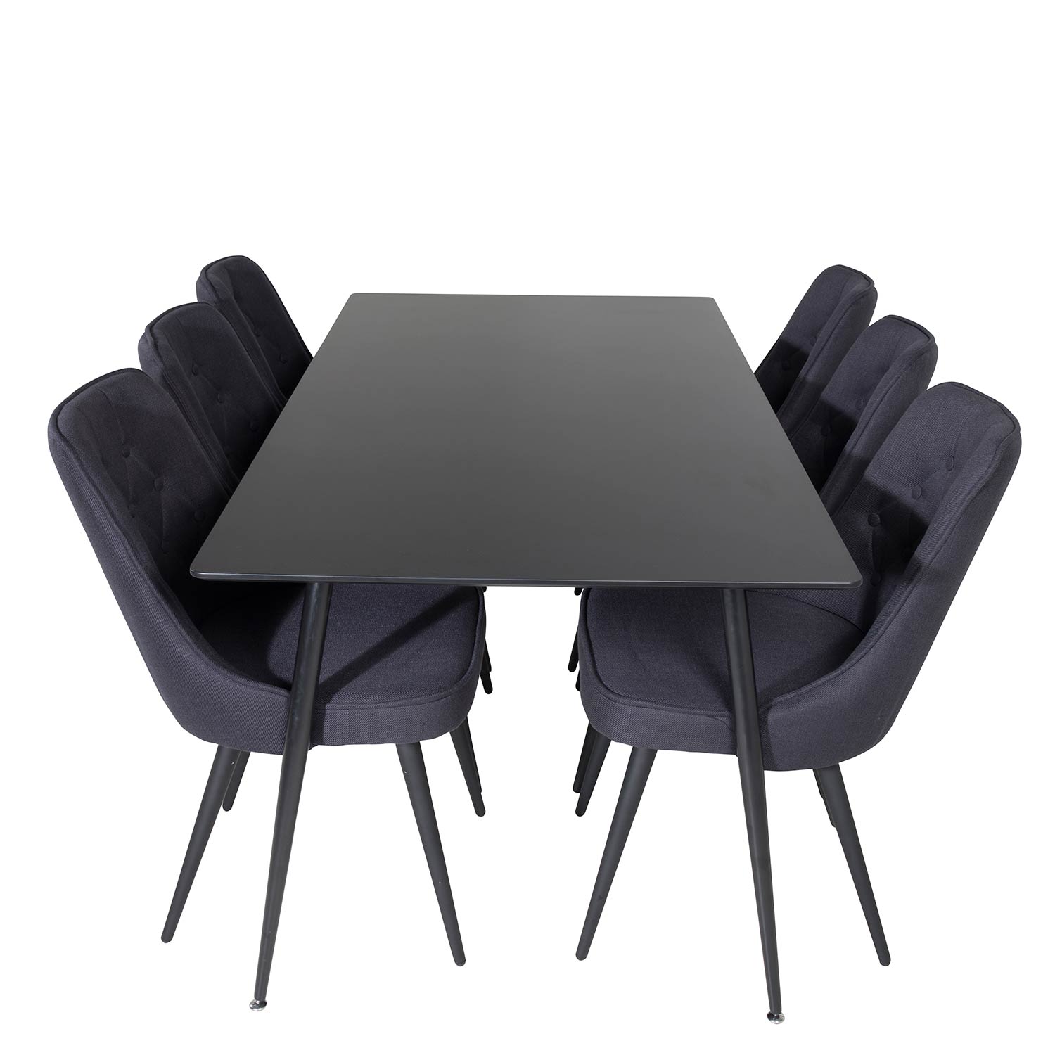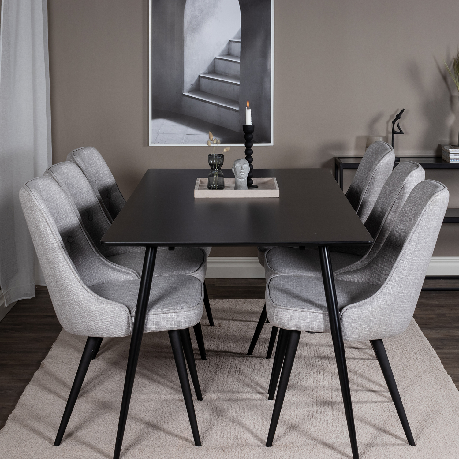 Matgrupp Venture Home Silvia med 6 Vera Stolar Polyestertyg är en stilren matgrupp med ett matbord i MDF och svarta bordsben i metall. Det medföljer sex matstolar med svarta stolsben i metall och sitsar i polyester.