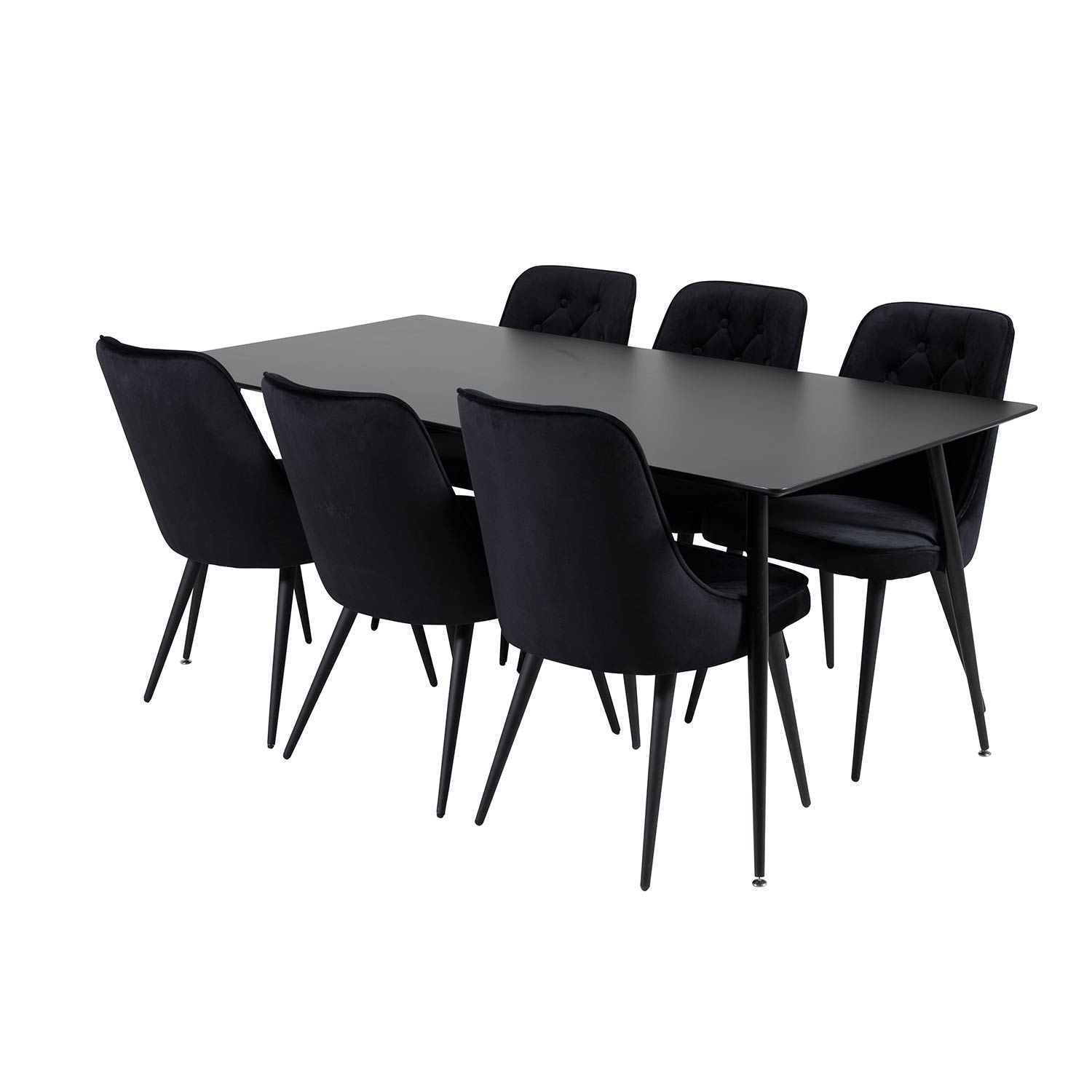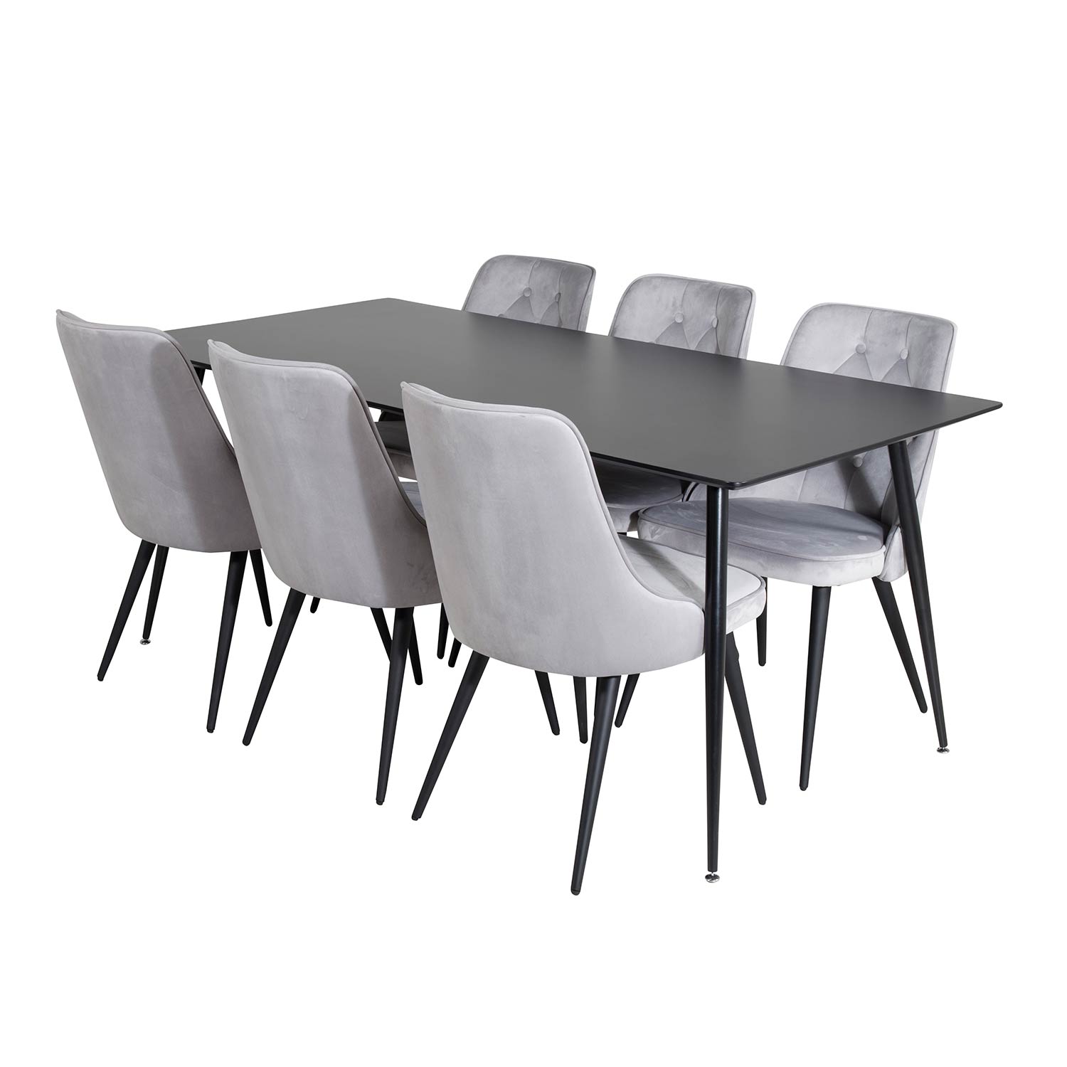 Matgrupp Venture Home Silvia med 6 Vera Stolar Sammet är en stilren matgrupp med ett matbord i MDF och svarta bordsben i metall. Det medföljer sex matstolar med svarta stolsben i metall och sitsar i sammet.