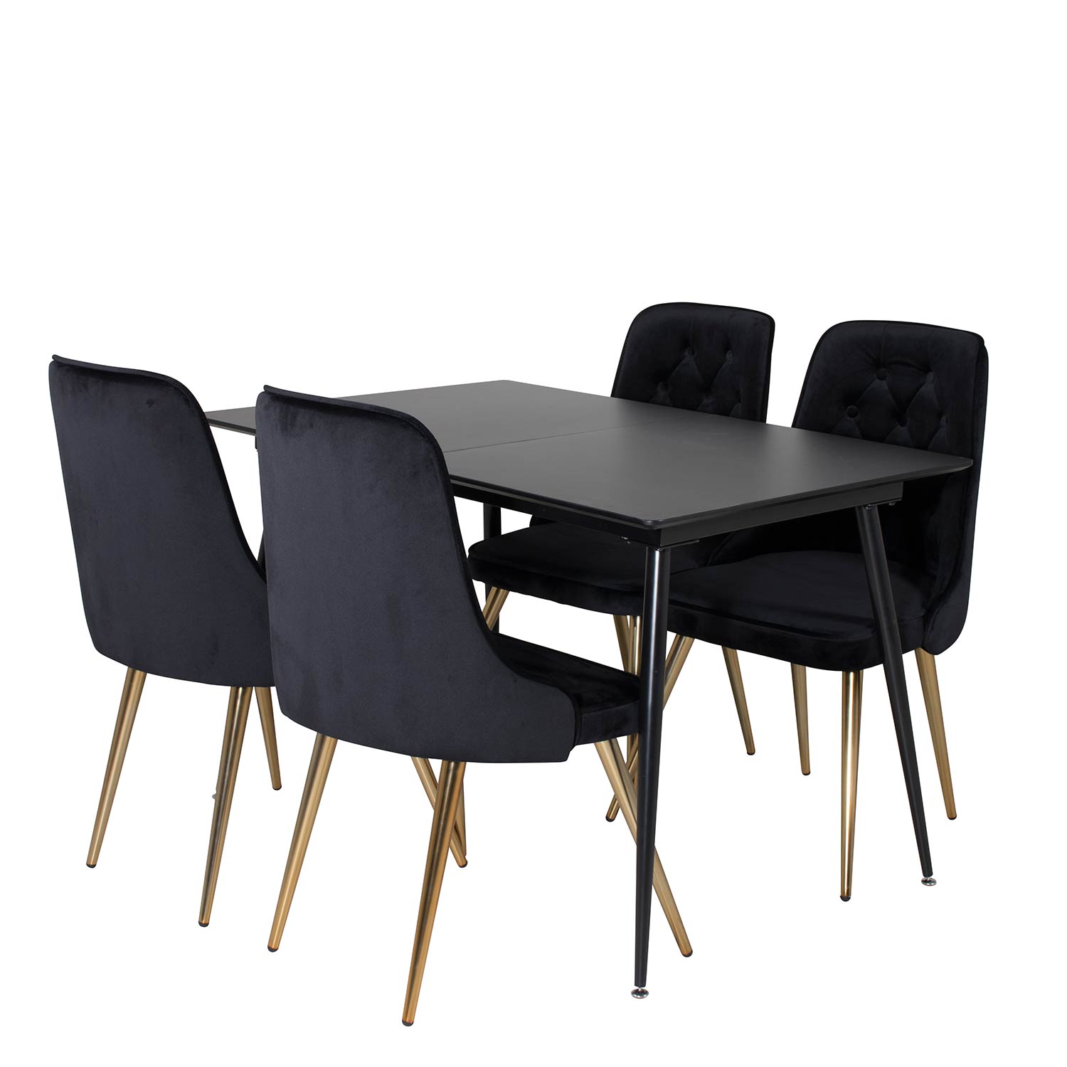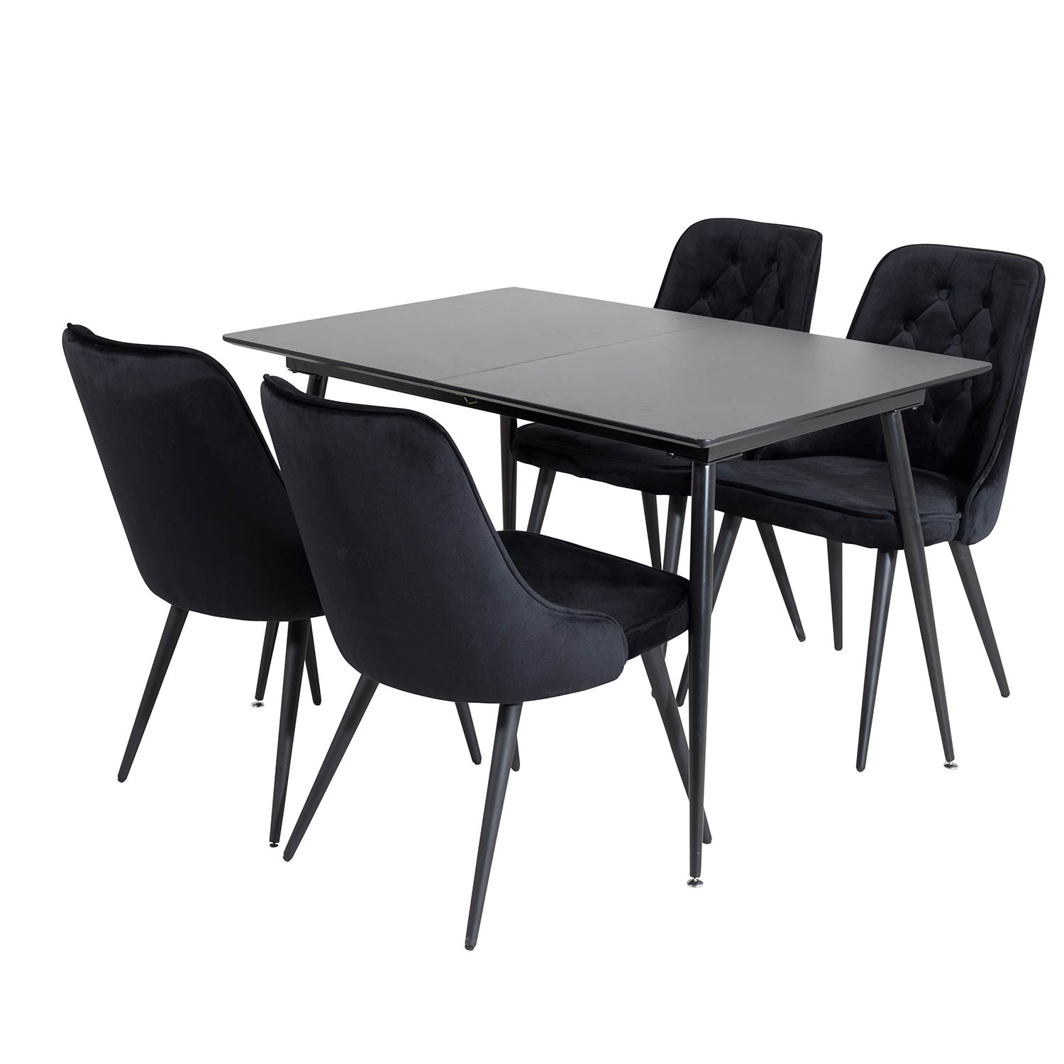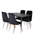 Matgrupp Venture Home Silvia med iläggsskiva och 4 Vera Stolar Sammet är en modern och praktisk matgrupp med ett rektangulärt matbord som levereras med en iläggsskiva. Bordet har en stomme och ben i svart pulverlackerad metall med en bordsskiva i svart melamin med en kärna av MDF. Det medföljer fyra matstolar i helklädd design med ben i metall. Stolarna har en rygg med knappar och dekorsöm samt rygg och sits i sammetstyg med mjuk stoppning. Lättare montering krävs.