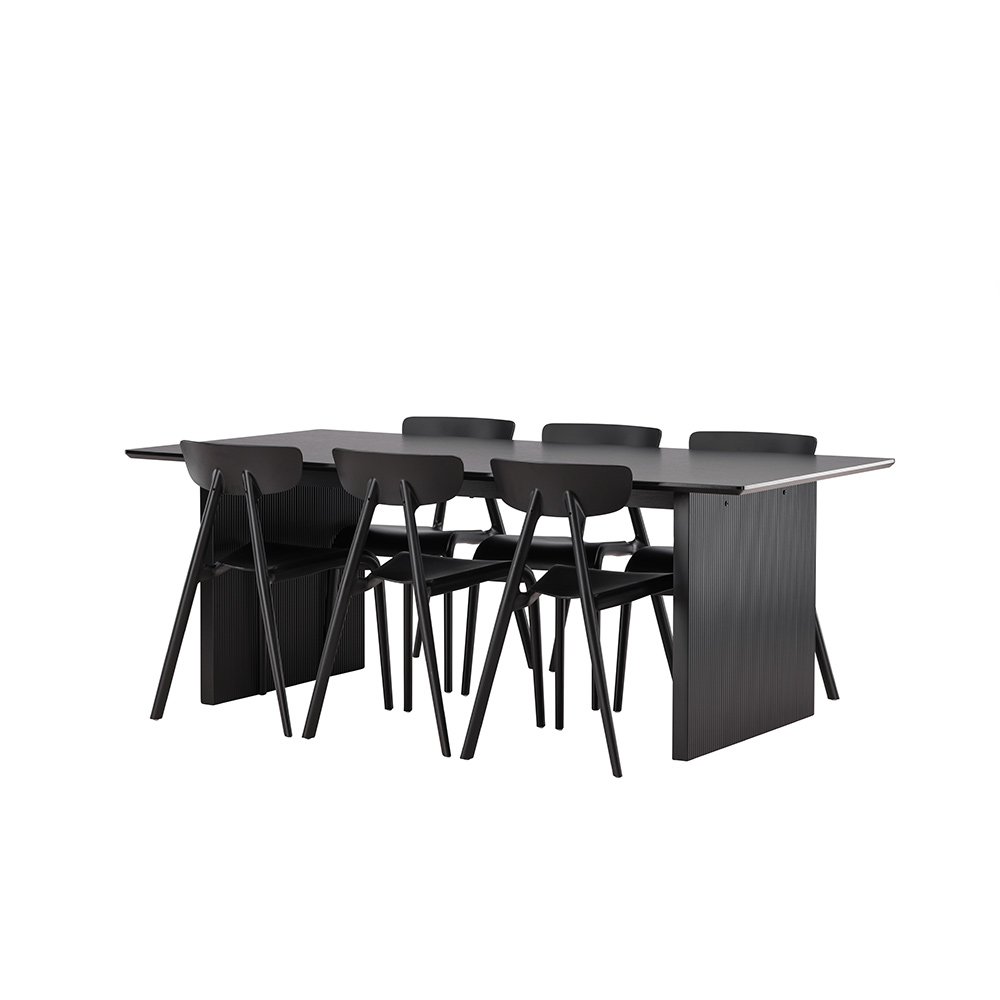 Den perfekta kombinationen av stil och tidlösa former! Vail matbord har raka nordiska former och är tillverkat i slitstarkt svart MDF - lika snyggt som praktiskt helt enkelt. Bordsskivan är tunn i en rektangulär utformning och balanserar på två bastanta träskivor som utgör underredet. Här i utmärkt kombination med våra läckra matstolar från serien Ursholmen. Tillverkade i slitstarkt plast i en smäcker kulör som är enkel att matcha med övrig inredning. Stolen har en nätt stolsrygg, något djupare sittplats och lätt utsvängda ben i Skandinavisk design. Skapa en trivsam mittpunkt att samla nära och kära vid!