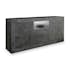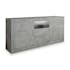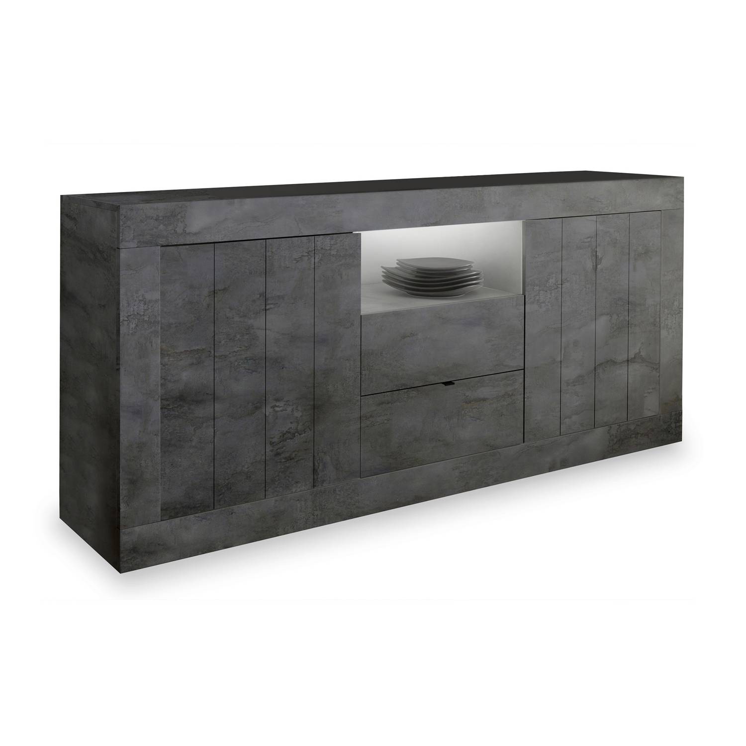 Skänken har en elegant grå färg som ger en modern touch till rummet och en betongliknande finish som ger en industriell känsla. Den är tillverkad av melamin och spånskiva, vilket ger både hållbarhet och stabilitet. Med två dörrar och två lådor får du gott om plats att förvara saker på ett organiserat sätt, och två hyllor ger plats för föremål du vill visa upp eller ha lättillgängliga.