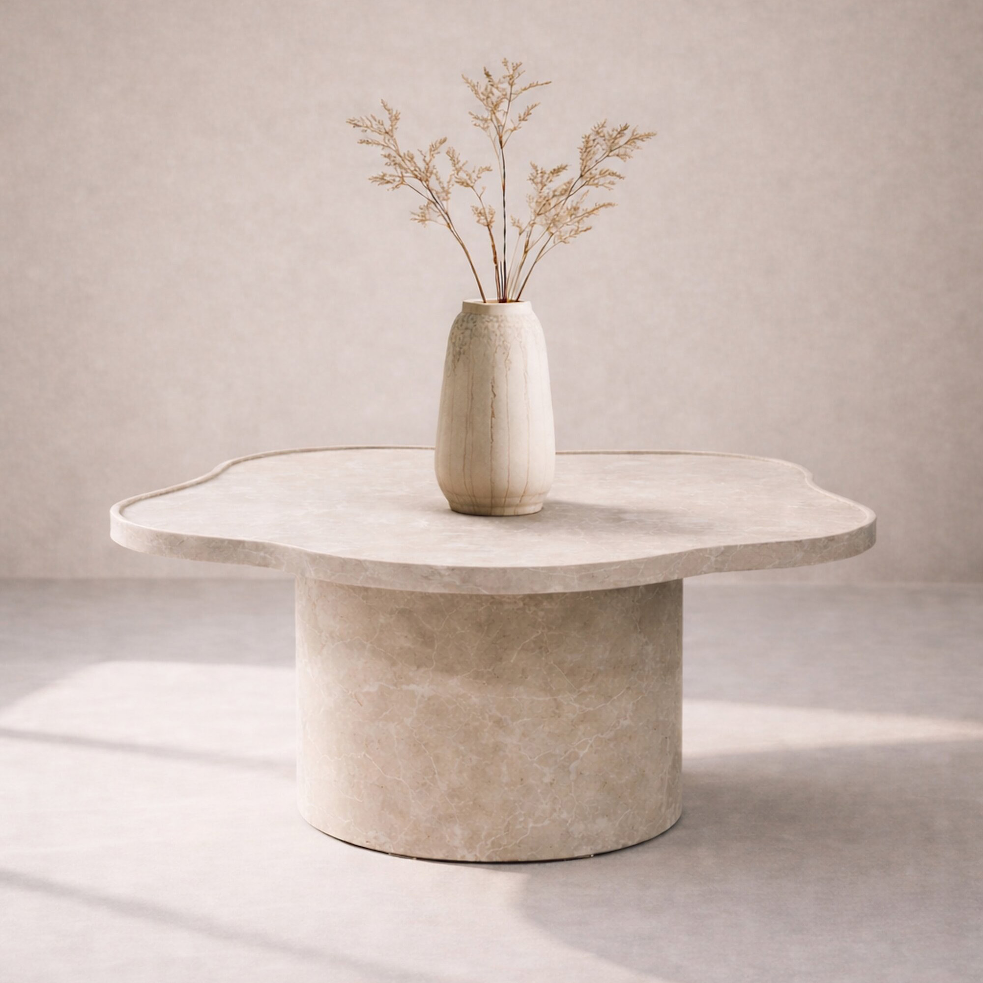 Den rundade designen skapar ett harmoniskt intryck medan den marmorinspirerade ytan tillför en lyxig känsla. Ilse blir snabbt rummets mittpunkt – perfekt framför soffan eller som ett elegant sidobord.