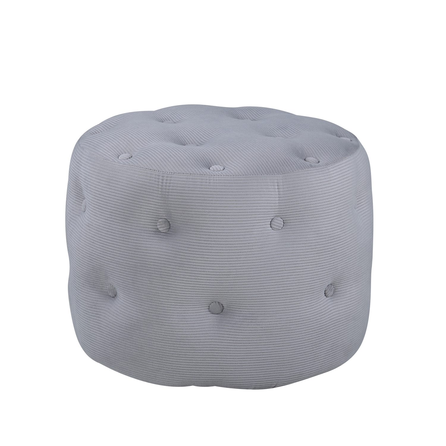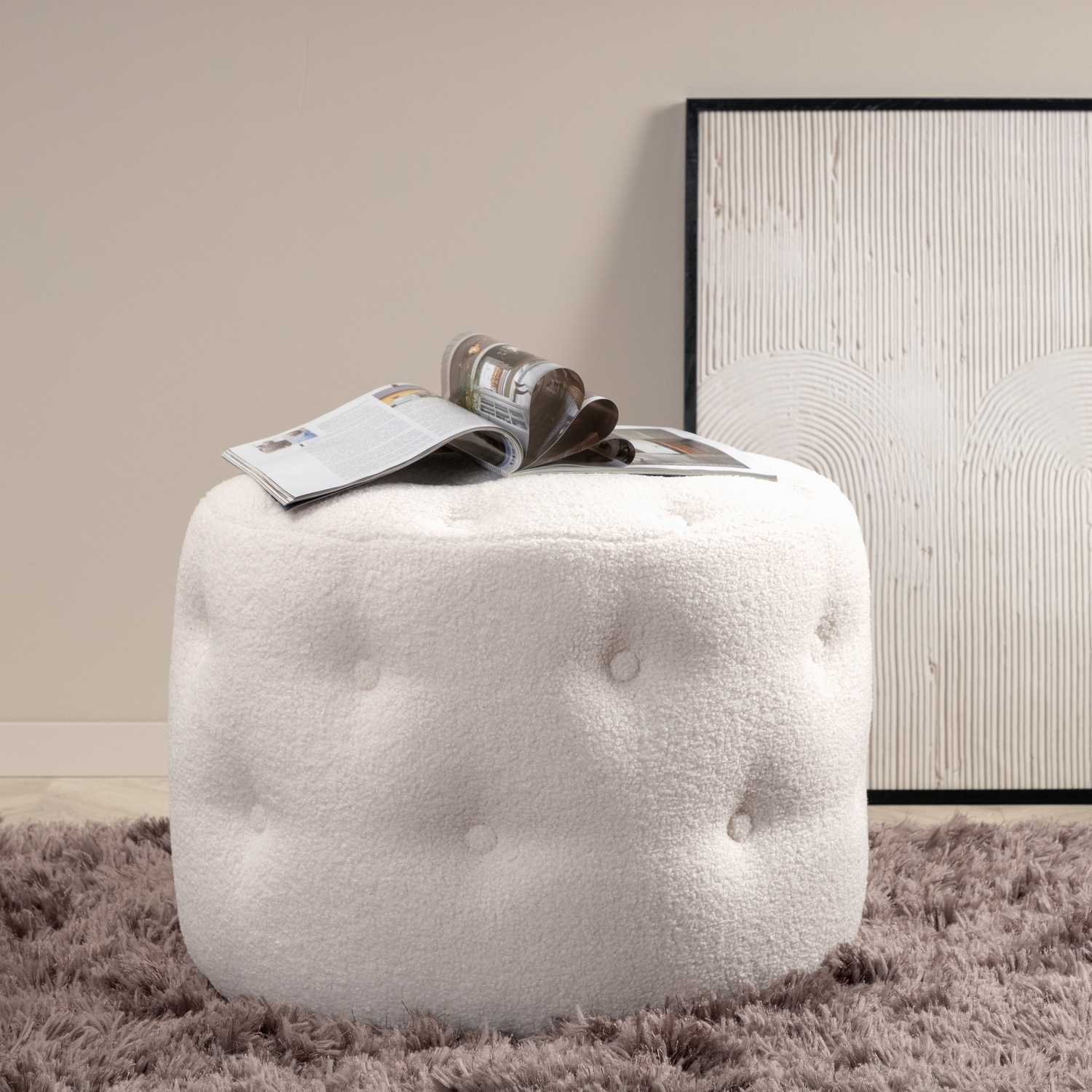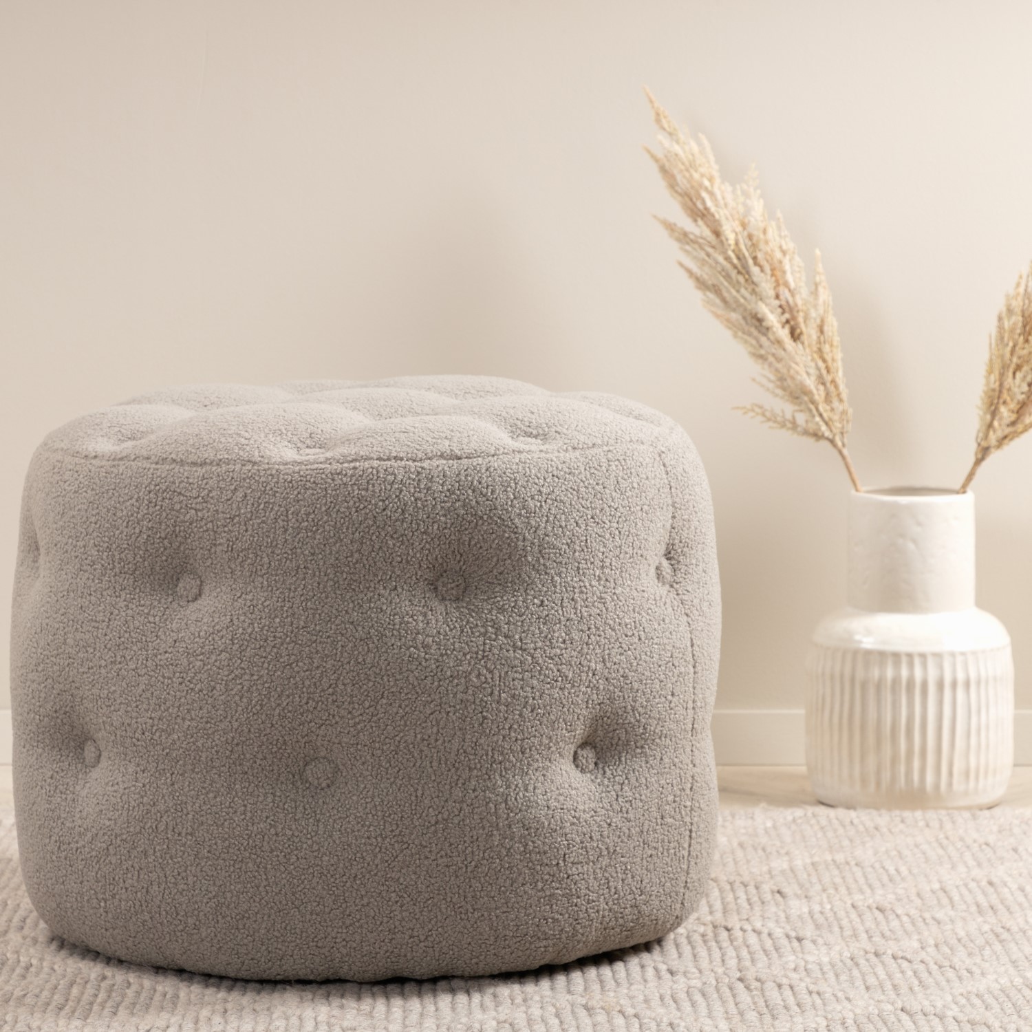 Sittpuff Venture Home Benjamin är en sittpuff i materialet skum, bomullsfiber, tyg och böjt trä. Puffens mått: höjd 44 cm, diameter 55 cm.