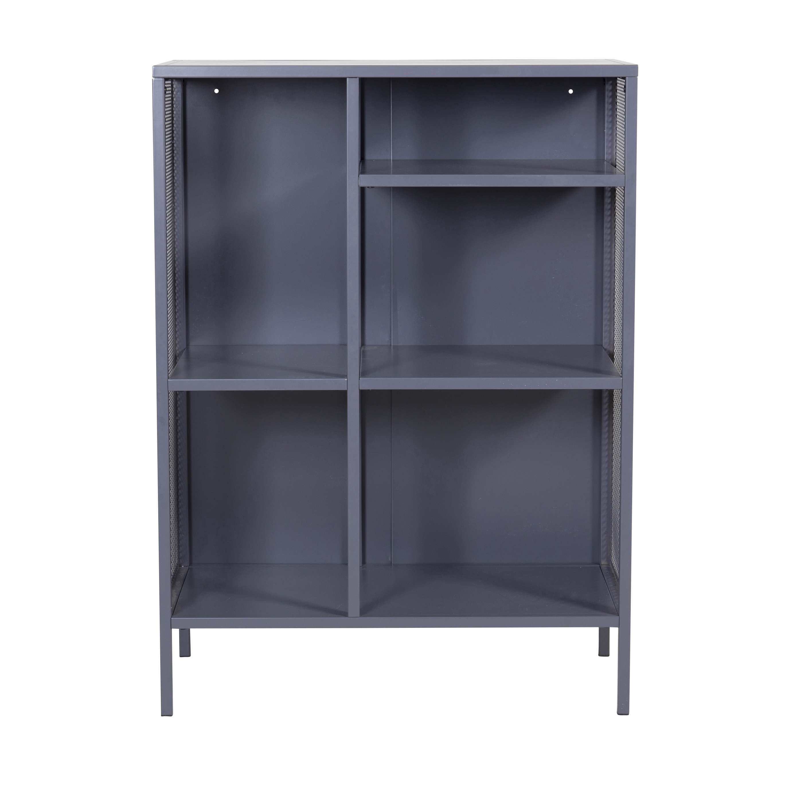 Misha bokhylla från Venture Home är av pulverlackerat stål med tre hyllplan i olika höjder. Bokhyllan har ett dekorativt nät på sidorna.