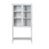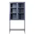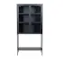 Misha från Venture Home är ett hög och brett vitrinskåp med två hyllplan inne i skåpet, två glasdörrar samt ett öppet hyllplan nedtill. Skåpet är av pulverlackerat stål.