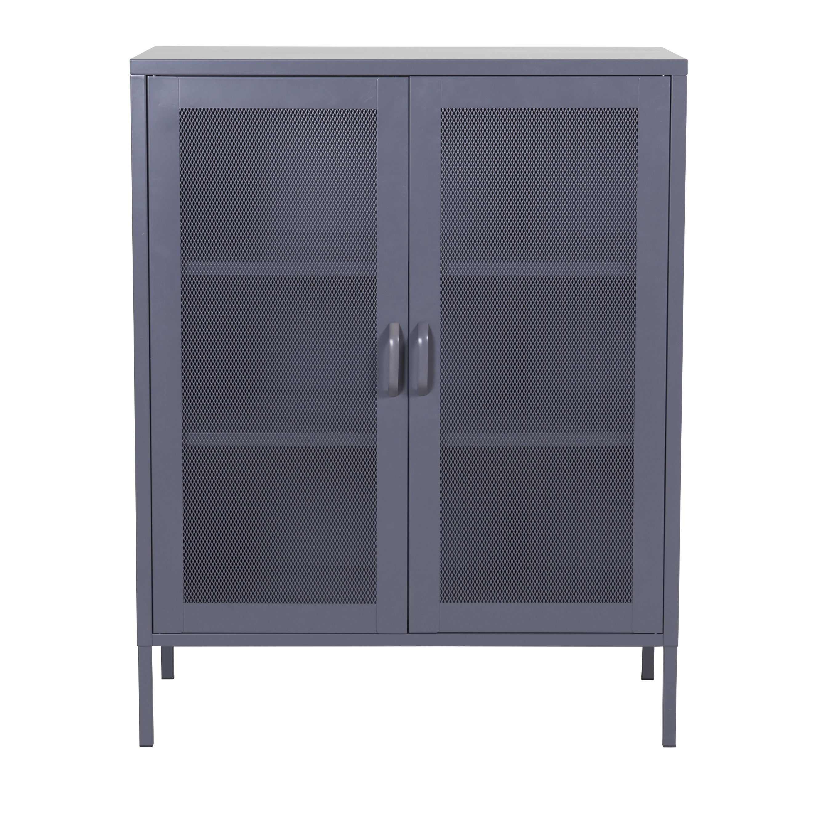 Misha från Venture Home är en bokhylla i pulverlackerat stål med två dörrar i dekorativt nät och två hyllplan.