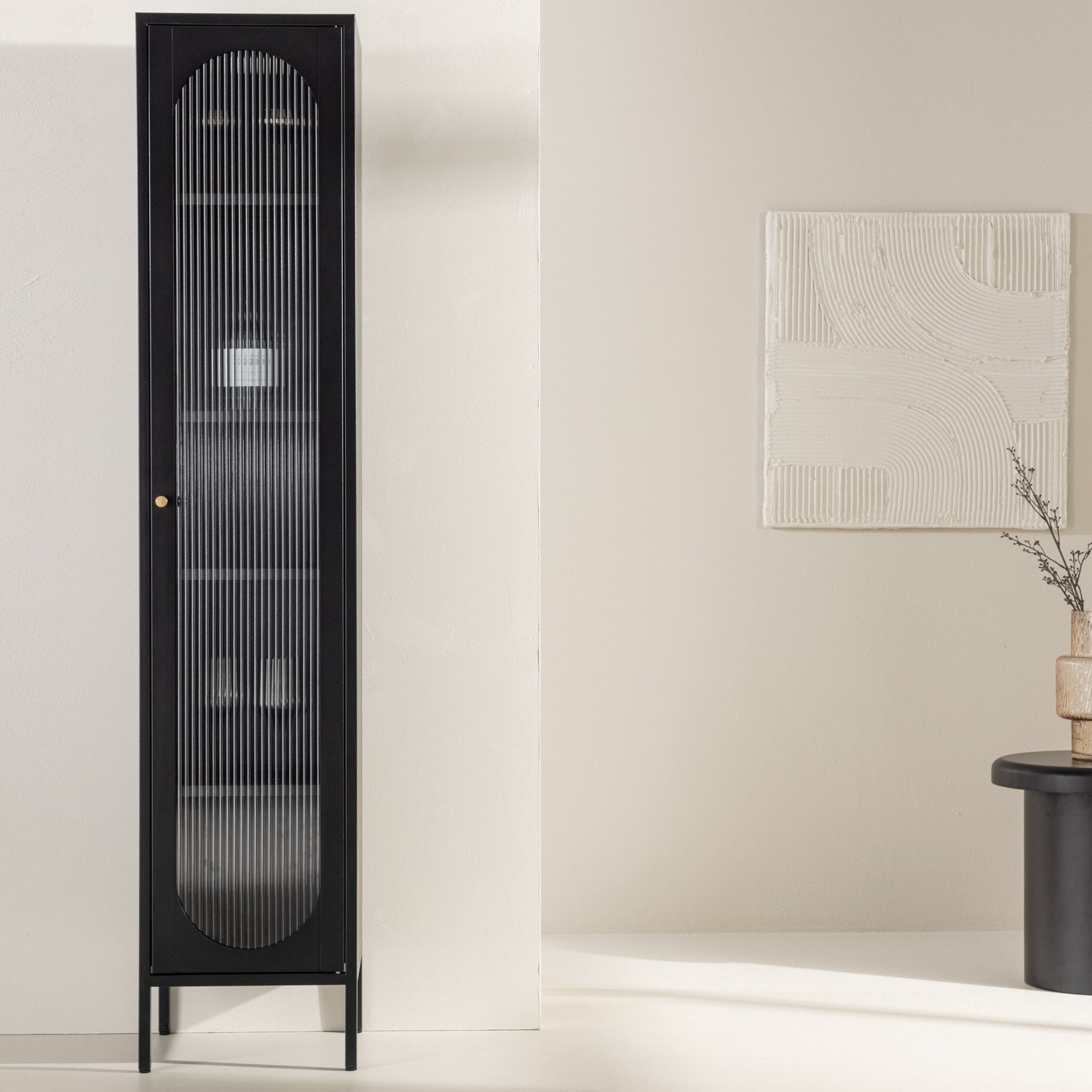 Skåpet är utrustat med fyra rymliga hyllplan, vilket ger dig gott om utrymme för att organisera. Dörren till skåpet är tillverkad av vågigt glas, vilket ger en subtil touch av textur och en unik visuell dimension till möbeln.