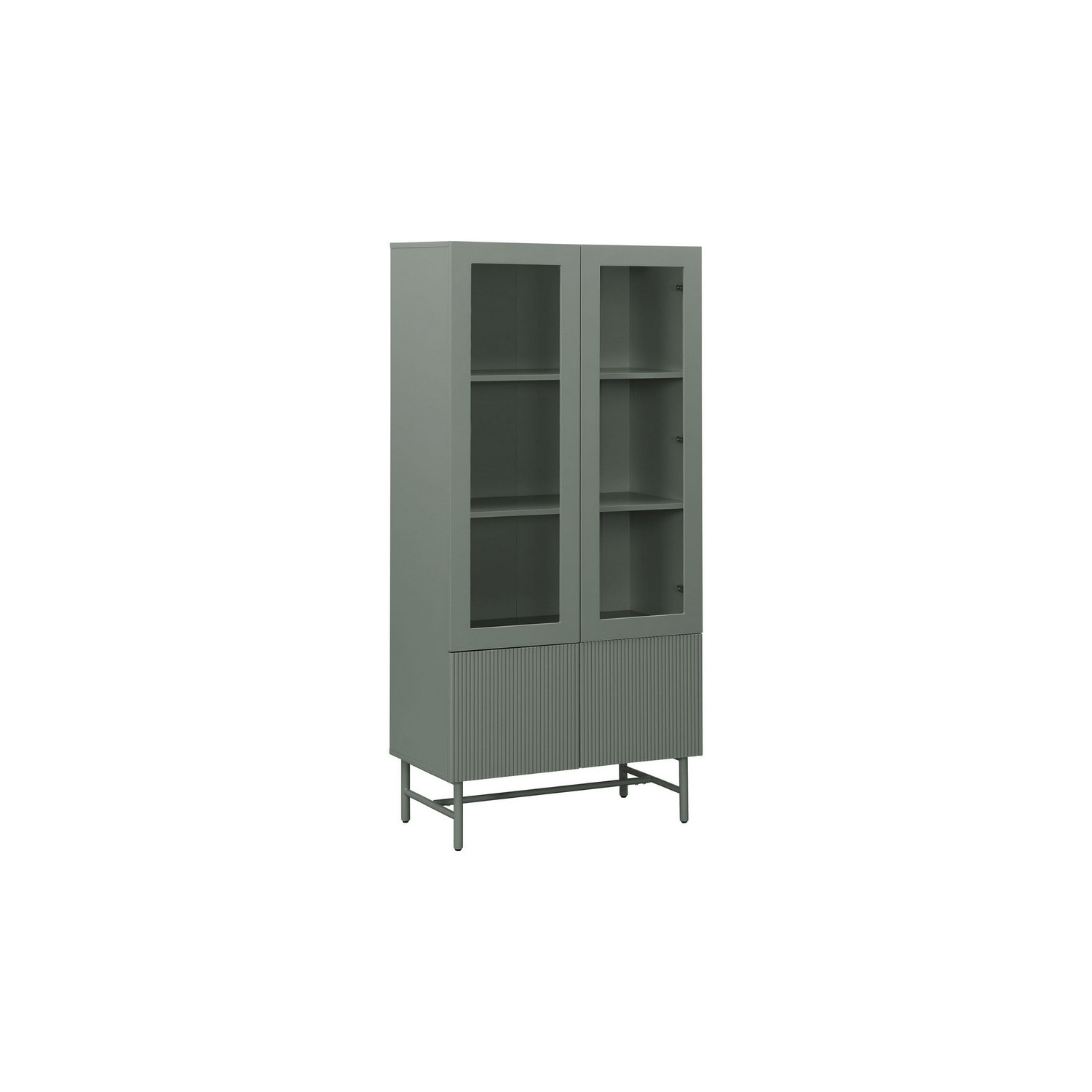 Underredet i pulverlackerad metall i matchande färg ger en stilren helhet och bidrar till en luftig känsla i rummet. Matterhorn finns i två olika färger – en mjuk grön ton och en neutral grå/beige – båda enkla att matcha med olika inredningsstilar. Glasdörrar med ribbade detaljer. Gott om förvaring och stabilt underrede i lackerad metall. Serien Matterhorn består av flera smarta förvaringmöbler i matchande design. Kombinera din tv-bänk med ett sidobord och vitrinskåp för en komplett uppsättning.