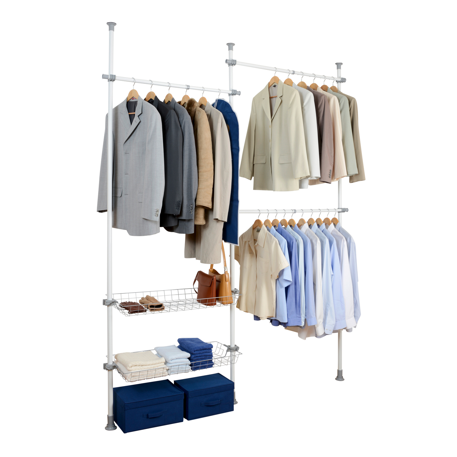 Detta individuellt justerbara organiseringssystem kan enkelt klämmas mellan golv och tak. Det har tre höjdjusterbara klädstänger som kan anpassas oändligt. Systemet inkluderar också två justerbara förvaringskorgar och en hänganordning.