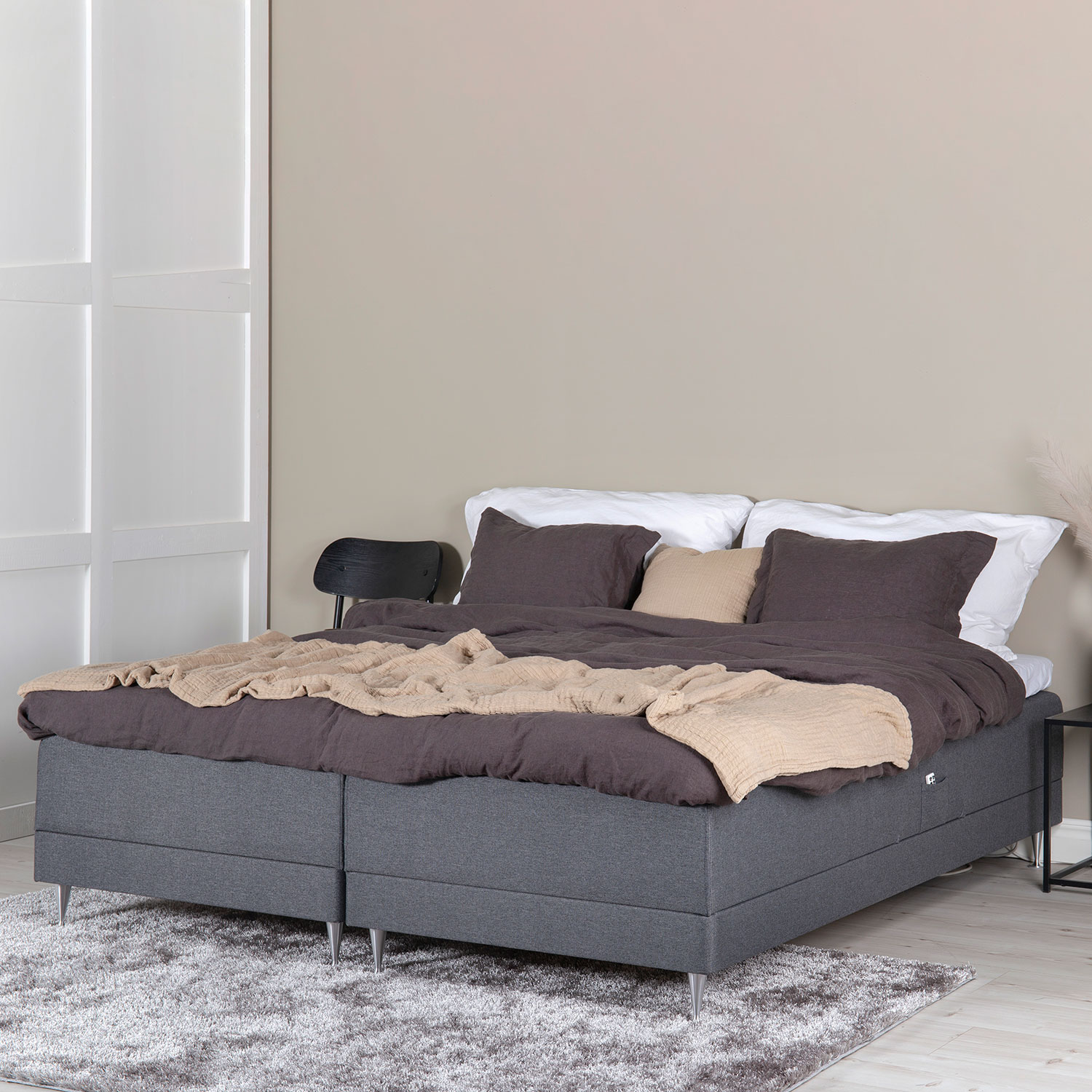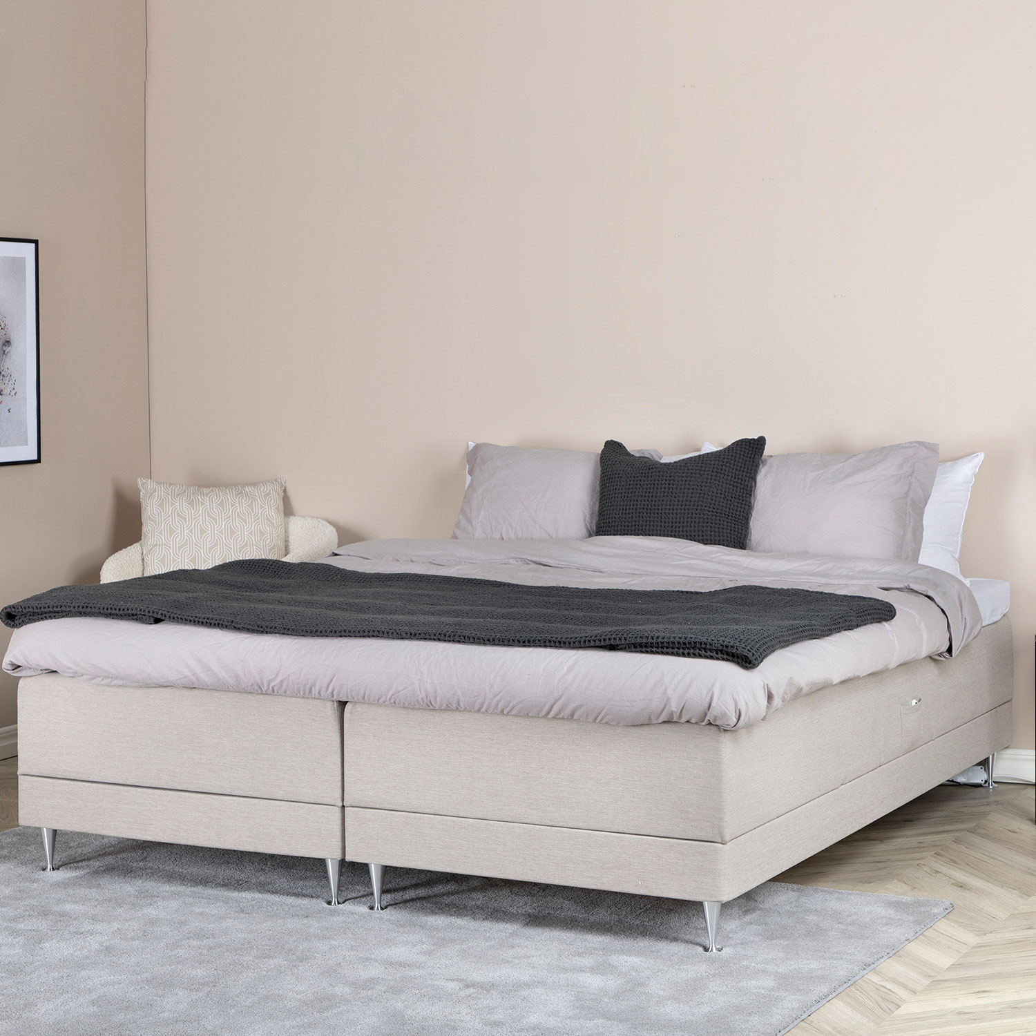 Sängen är uppbyggd för att ge en skön sovkomfort och ett enhetligt intryck i sin helklädda design. Sängramarna kommer i 2×90 (180 cm) bredd, där ena delen är i fasthet medium och andra delen fast. Runt resårmadrasserna finns en robust ram tillverkad i granträ. Den pikerade bäddmadrassen är uppbyggd av mikrofibervadd och kallskum. Hela sängen vilar på champagneben i silvrig aluminium.