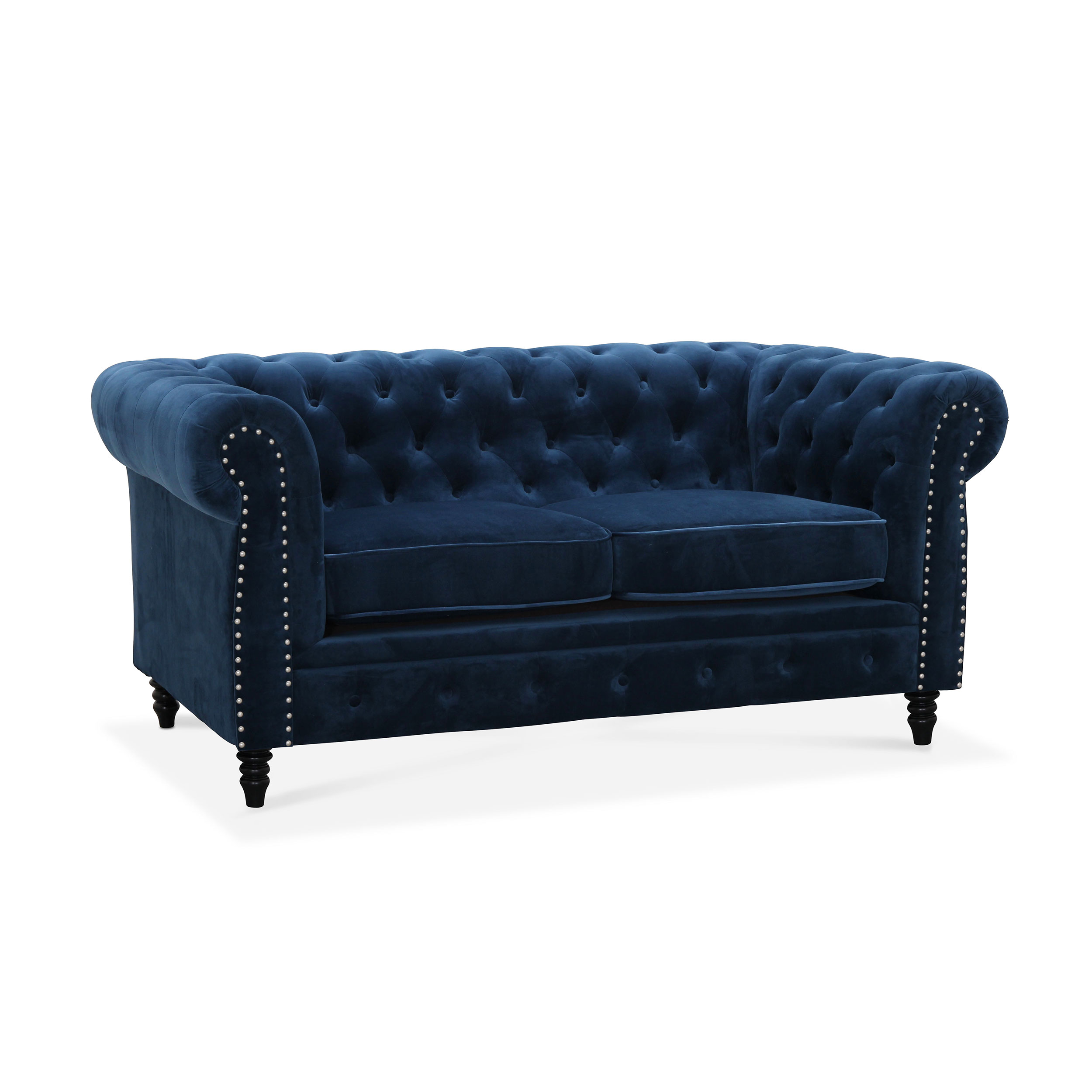 2-sitssoffa Cambridge från Hagagruppen i sammet och chesterfield-modell. Soffan har snyggt svarvade ben, klädda knappar och dekorativa pärlspikar.