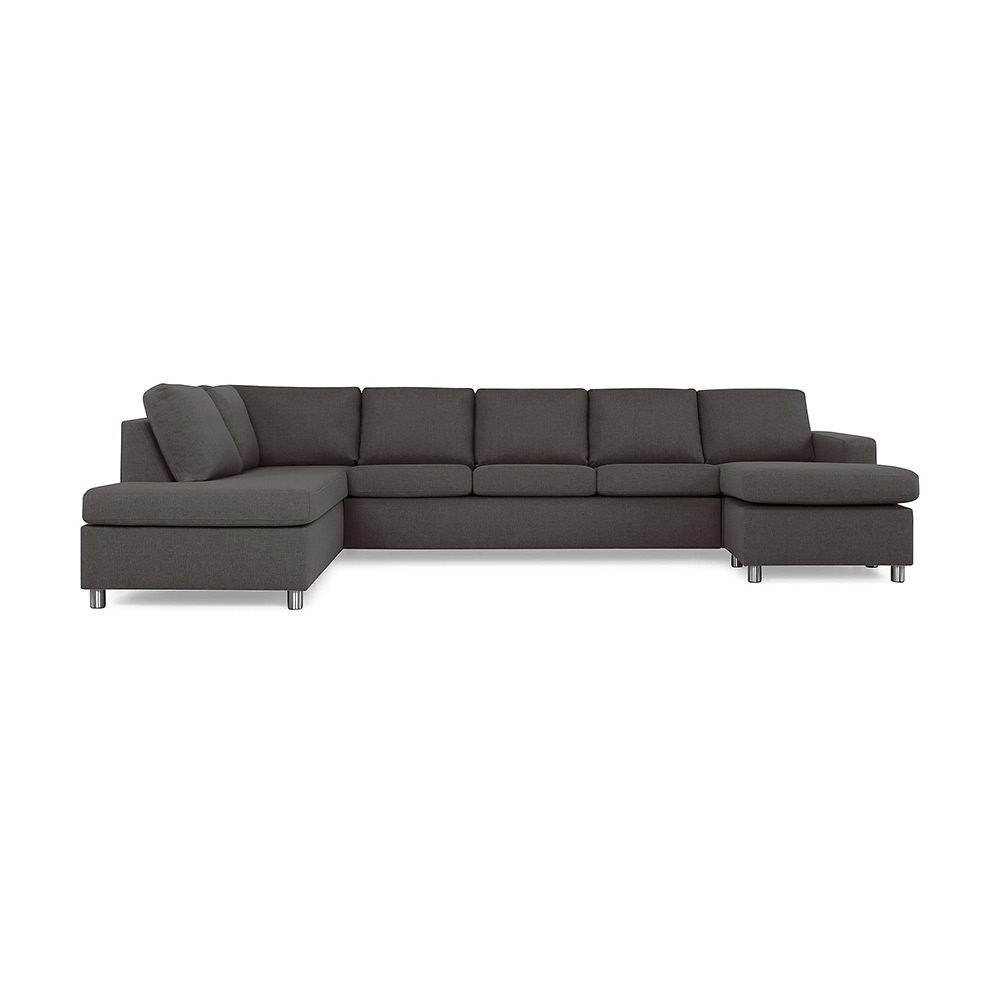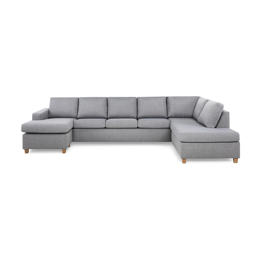 Stor u-soffa i XL-modell från Scandinavian Choice med en divan och ett öppet avslut. Soffan har en enkel och stilren design som gör att den passar i de flesta hem och miljöer. Tålig stomme av massivt trä och sitsplymåer med 30 kg polyeterskum ger en medelfast komfort som passar de flesta. Tyget på sits- och ryggplymåerna är avtagbart.