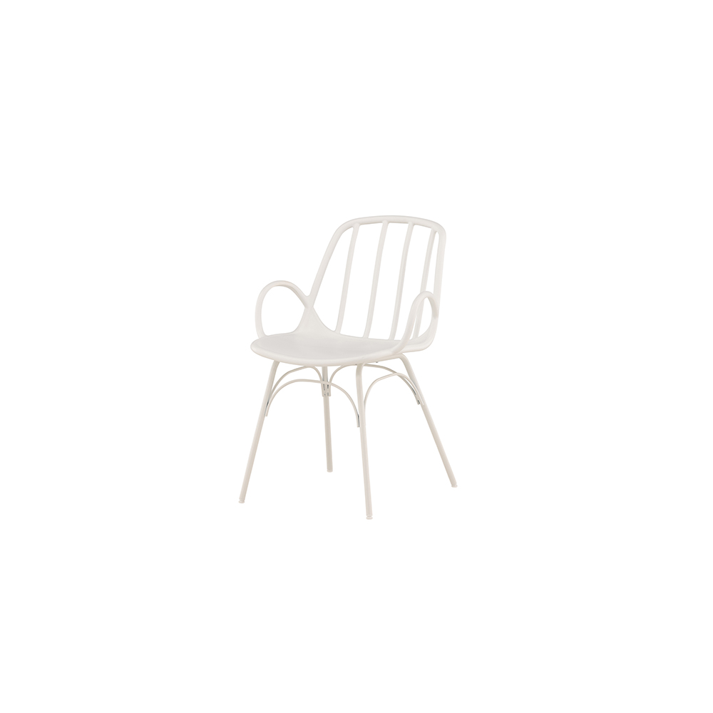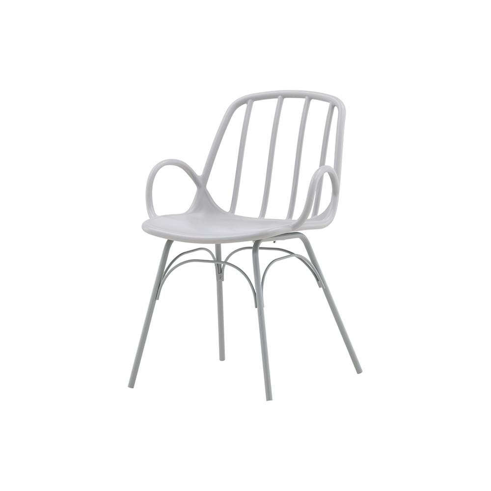 Den här stolen har en dekorativ och detaljrik design med böjda former, integrerade armstöd och utsvängda ben, genomgående tillverkad i slitstark plast och stål i smäcker greige kulör. Matcha med ett läckert matbord så får du en komplett matgrupp att samla familjen till för framtida måltider.