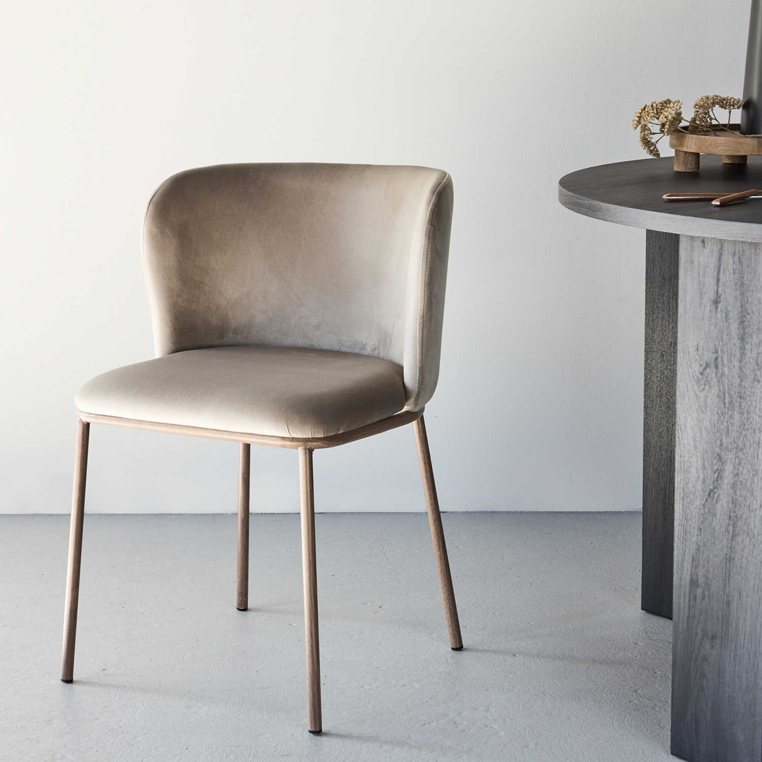 Edina är designad med både estetik och ergonomi i åtanke, vilket gör den idealisk för långa middagar och sociala tillställningar. Den stadiga konstruktionen och den högkvalitativa sammetsklädseln säkerställer att stolen inte bara är vacker att se på, utan också hållbar och bekväm i dagligt bruk.