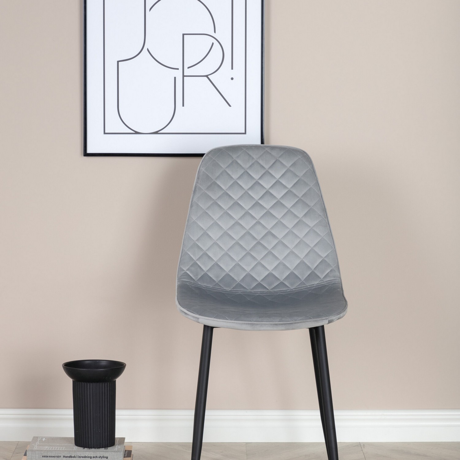 Matstol Venture Home Polar är en matstol i sammet med metallben. Stolen har en lätt rundad rygg och sits i stoppat tyg med dekorsömmar på insidan som bildar ett rutmönster.