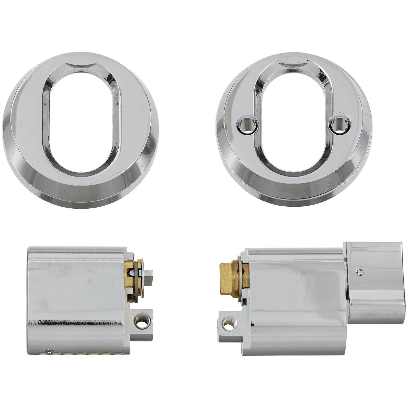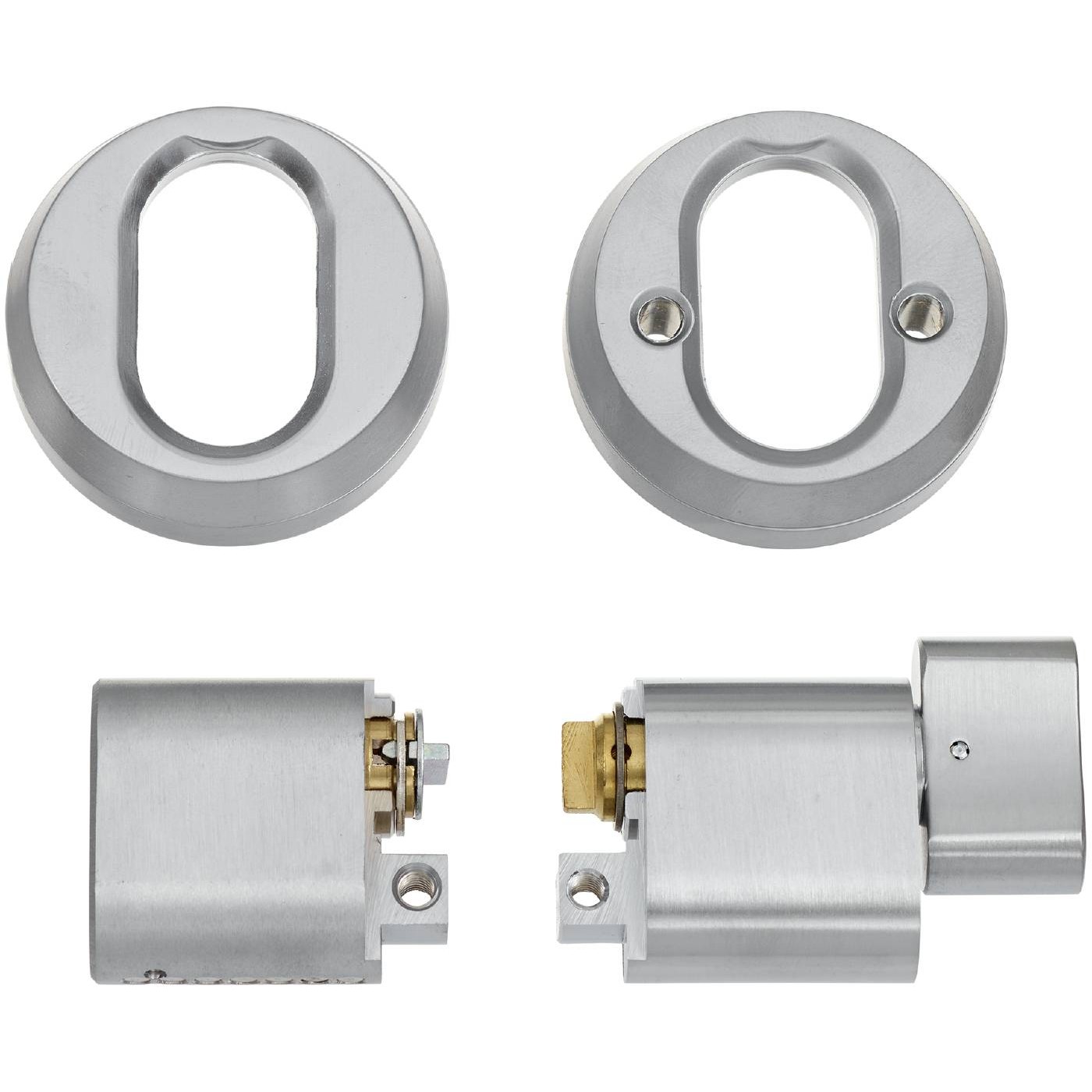 Cylinderset med ovalcylinder utsida och vredcylinder insida för genomgående fastsättning. Levereras med cylindrar, universal cylinderringar, skruv och förläningsdel 12,5mm. Används där inte speciella säkerhetskrav ställs.