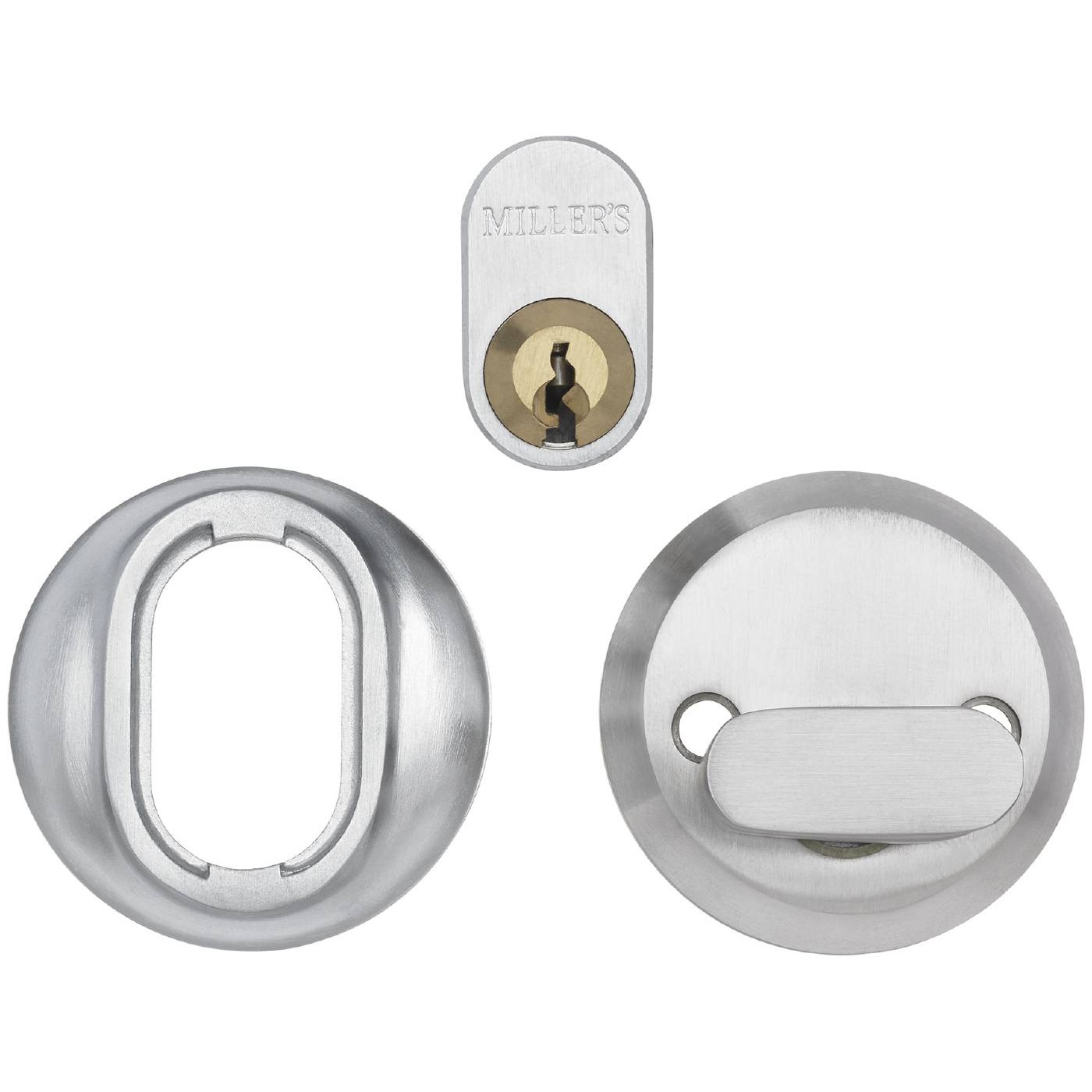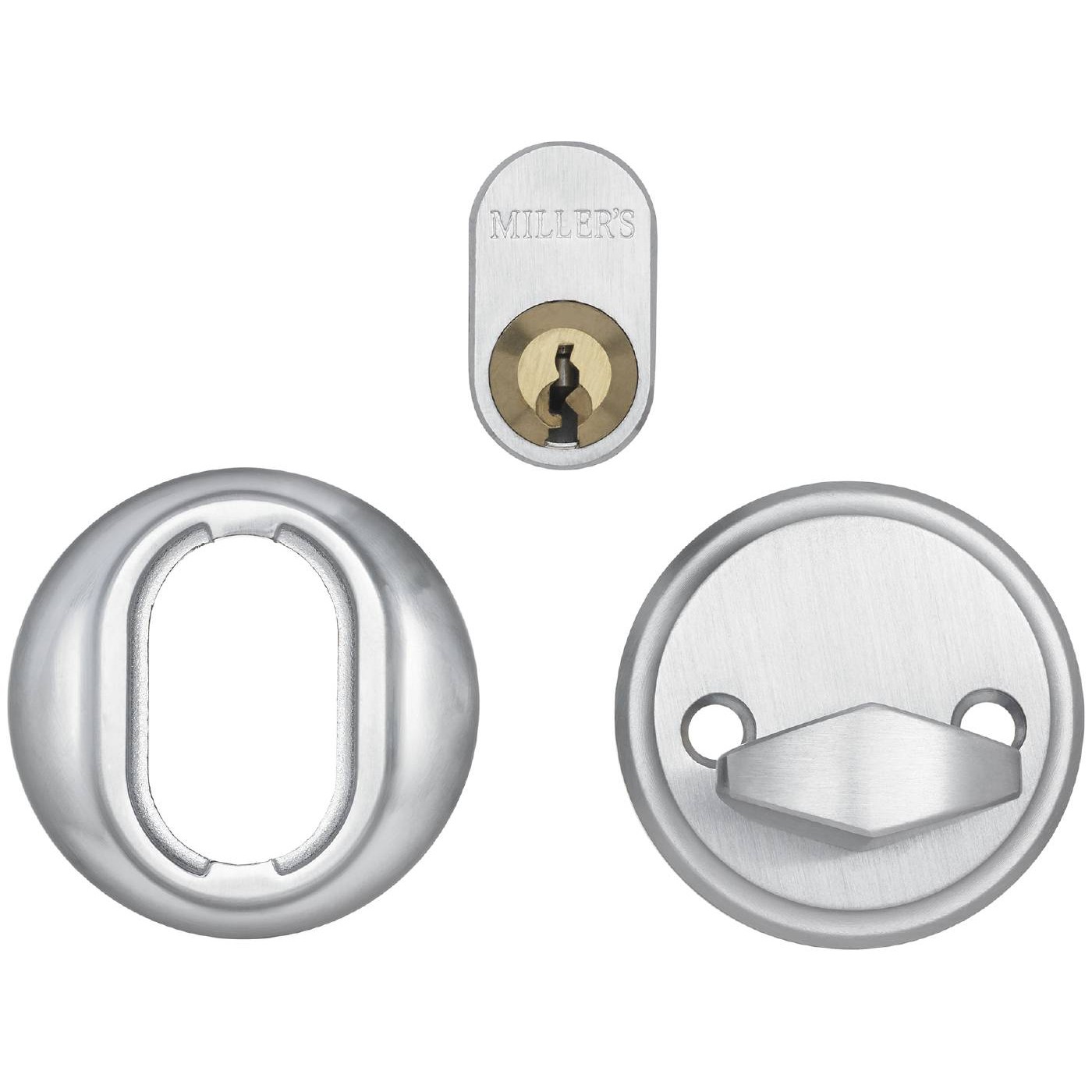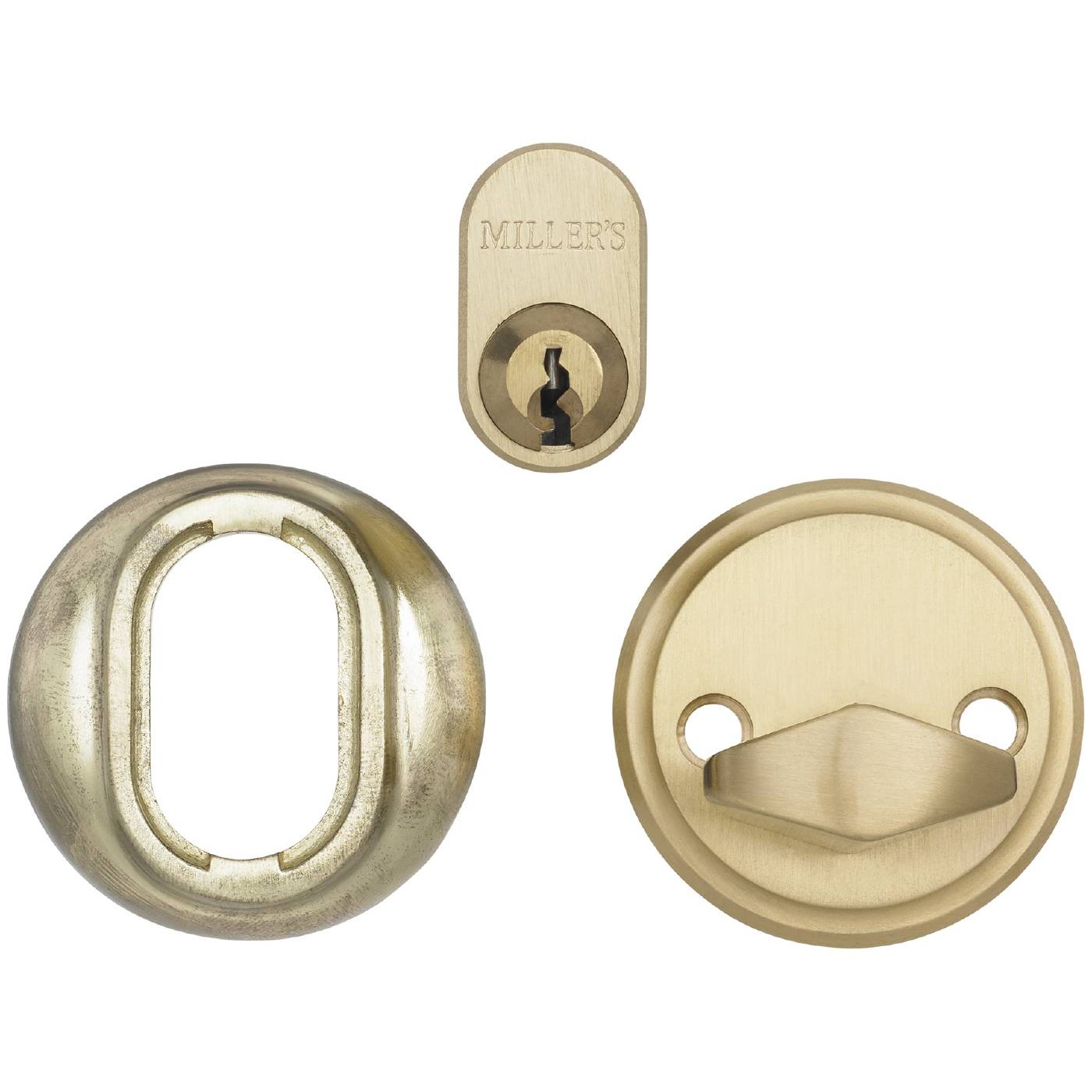Cylindersats innehållande: Oval cylinder med 5 nycklar, cylinderring universal 8-21mm, vred, vredmedbringare 83mm, cylinderskruv 28mm, vredskruv 90mm.